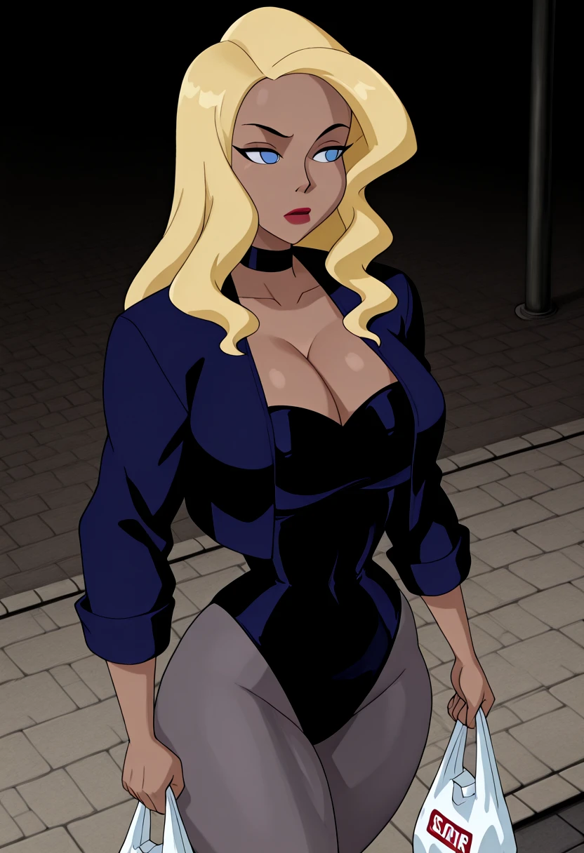 dark blue jacket, cropped jacket, strapless leotard, black leotard, cleavage, collarbone, grey pantyhose, black choker, retro art style,