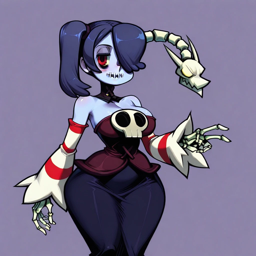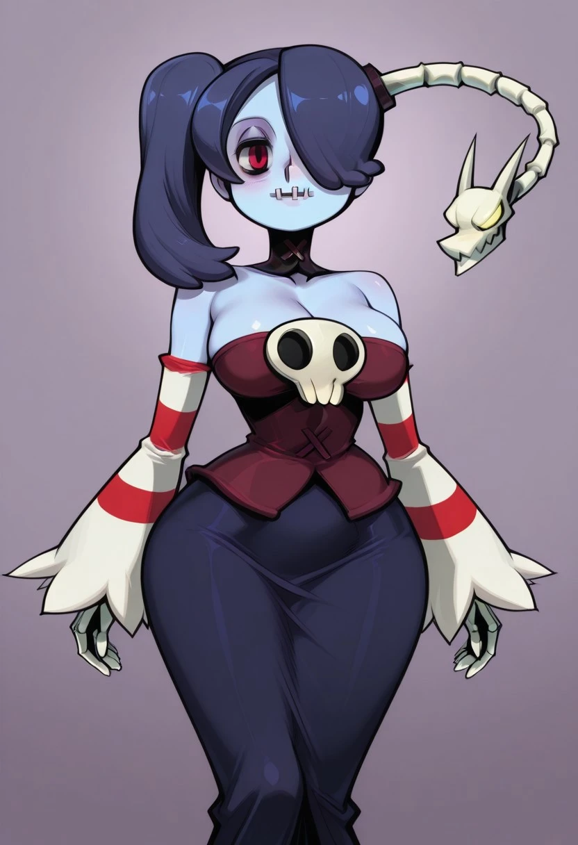 <Lora:skullsquid:1>, blue skin, zombie, stitches, stitched mouth, blue hair, (((one single side ponytail))), hair over one eye, long hair, red eyes, object through head, skeletal hands, large breasts, (skeletal hands:1.1), wide hips
