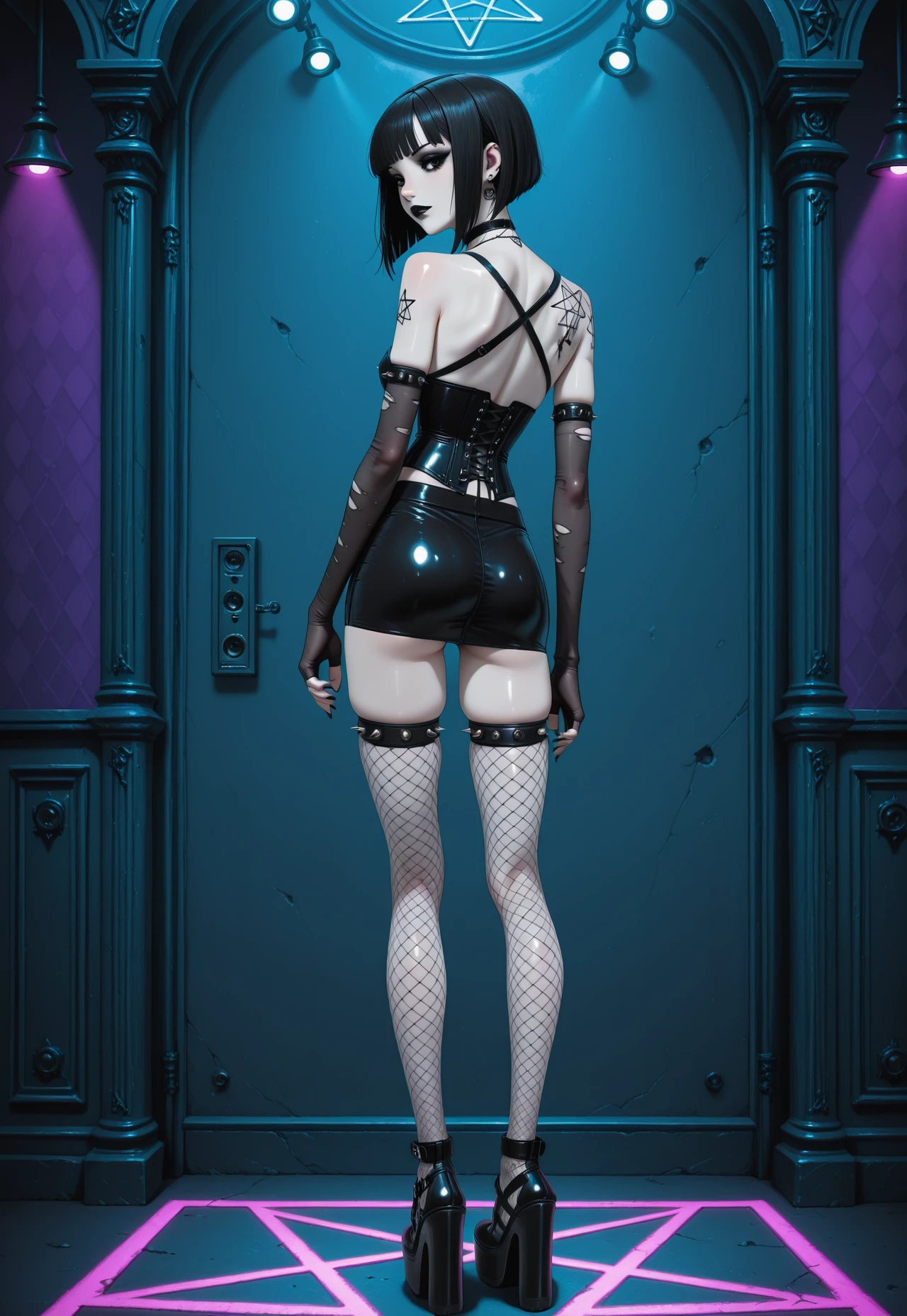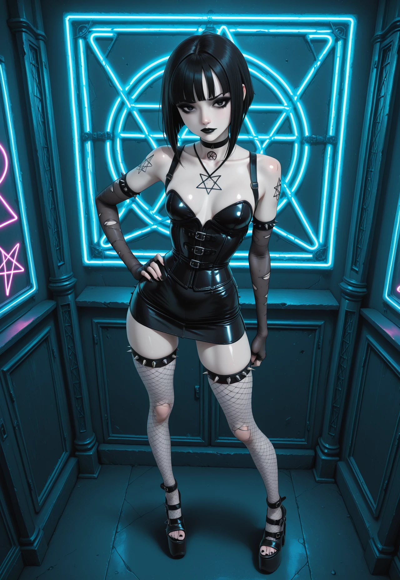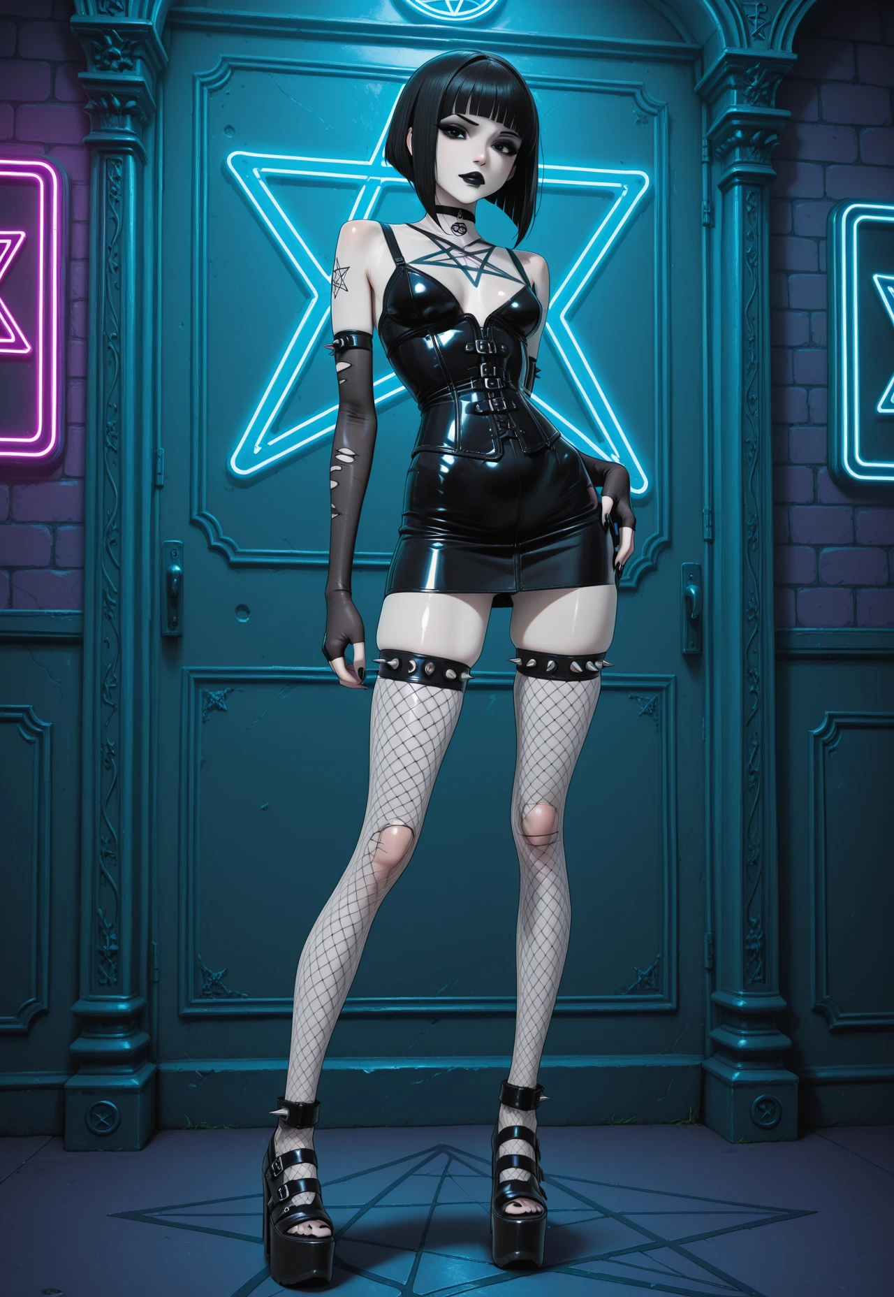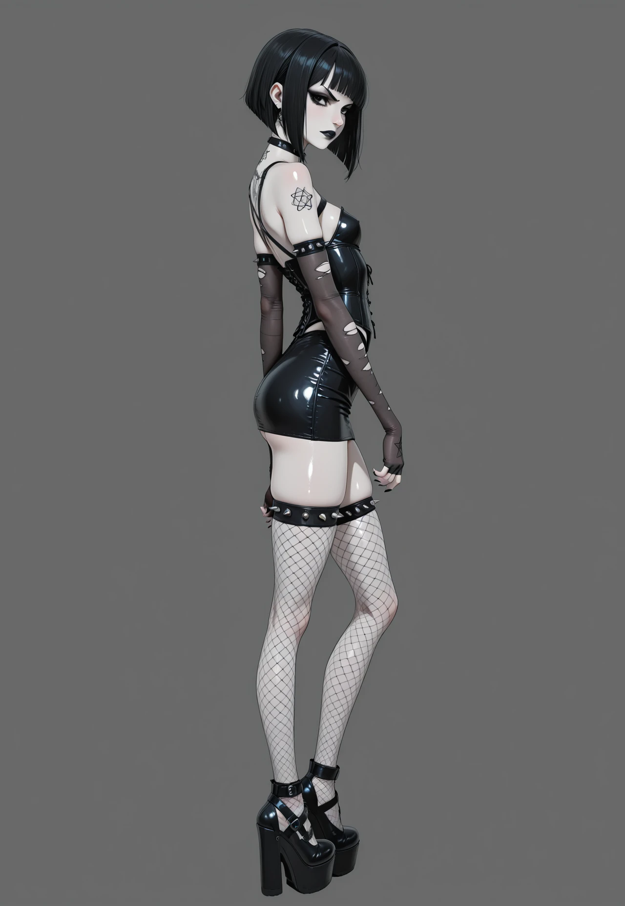dystopiagoth, gothic, pale skin, inverted bob cut, black eyes, makeup, black lips, choker, small breasts, fingerless elbow gloves, tattoo, black corset, black miniskirt, fishnet thighhighs, black platform footwear, platform heels, fishnets, torn clothes, pentagram, spikes,