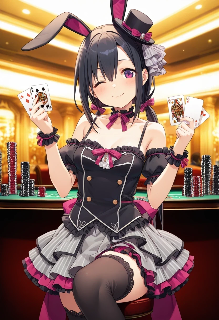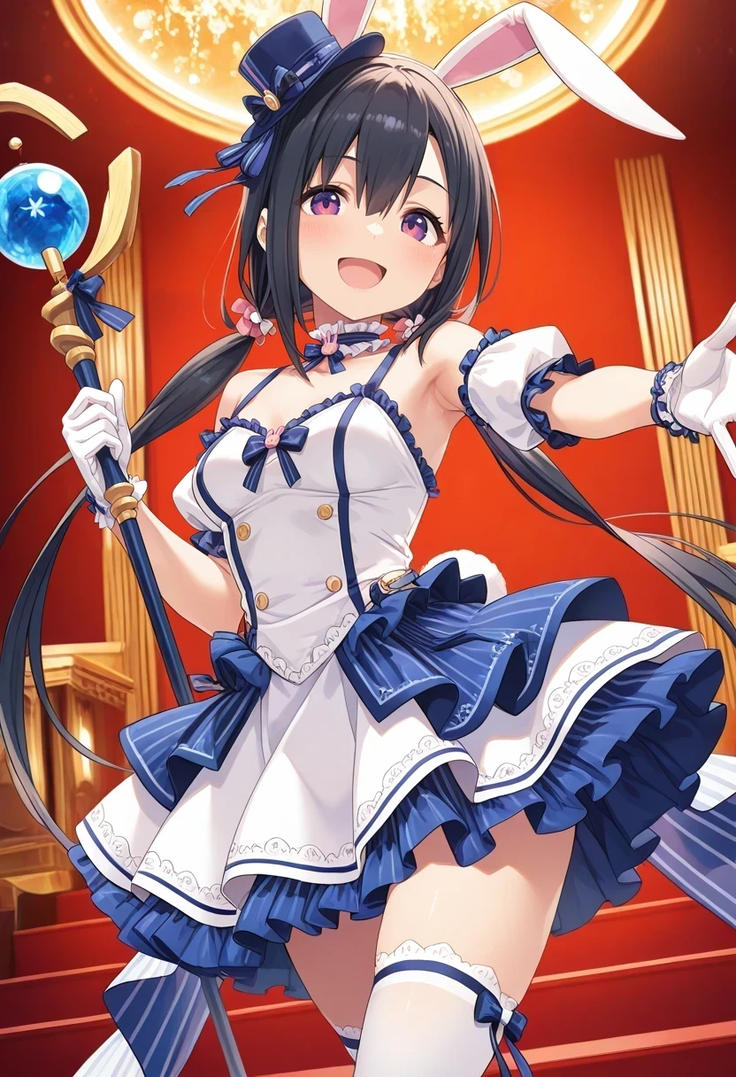 mini top hat,rabbit ear hairband,frilled choker,bare shoulder,frilled straps,detached sleeves,puffy short sleeves,double-breasted,frilled skirt,grey skirt,layered skirt,black thighhighs,Casual 2:
