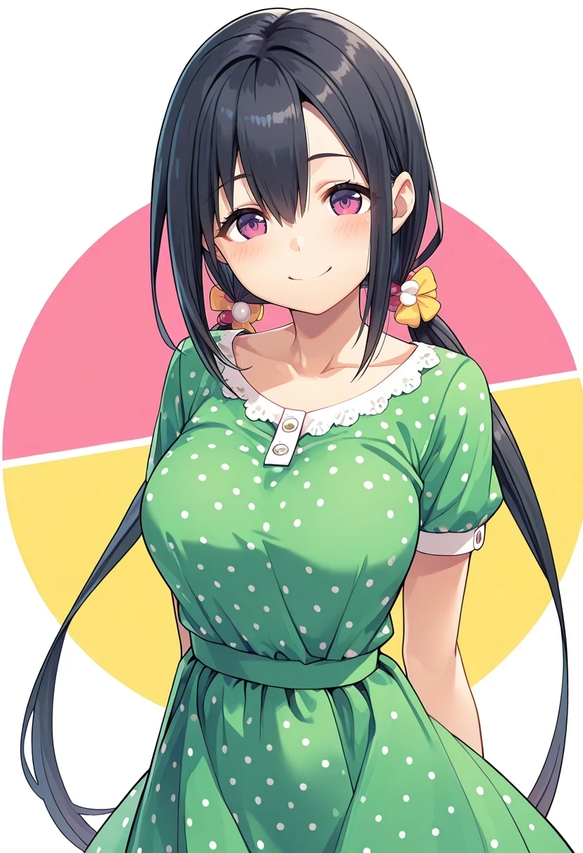 hair bobbles,green dress,polka dot dress,short sleeves,...Or try your own. It's pretty flexible.