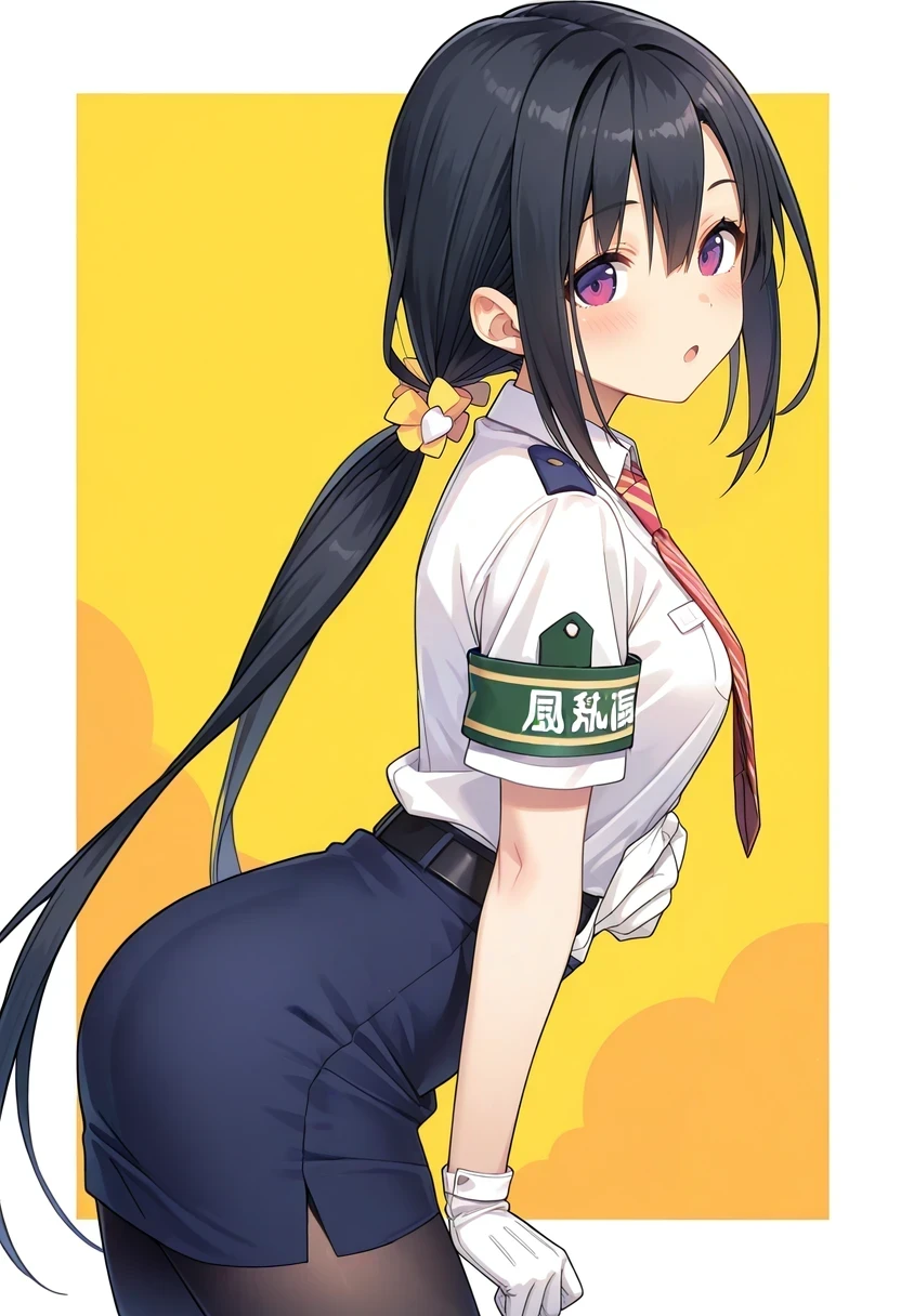 red necktie,striped necktie,collared shirt,white shirt,short sleeves,green armband,white gloves,black belt,pencil skirt,blue skirt,black pantyhose,Casual: