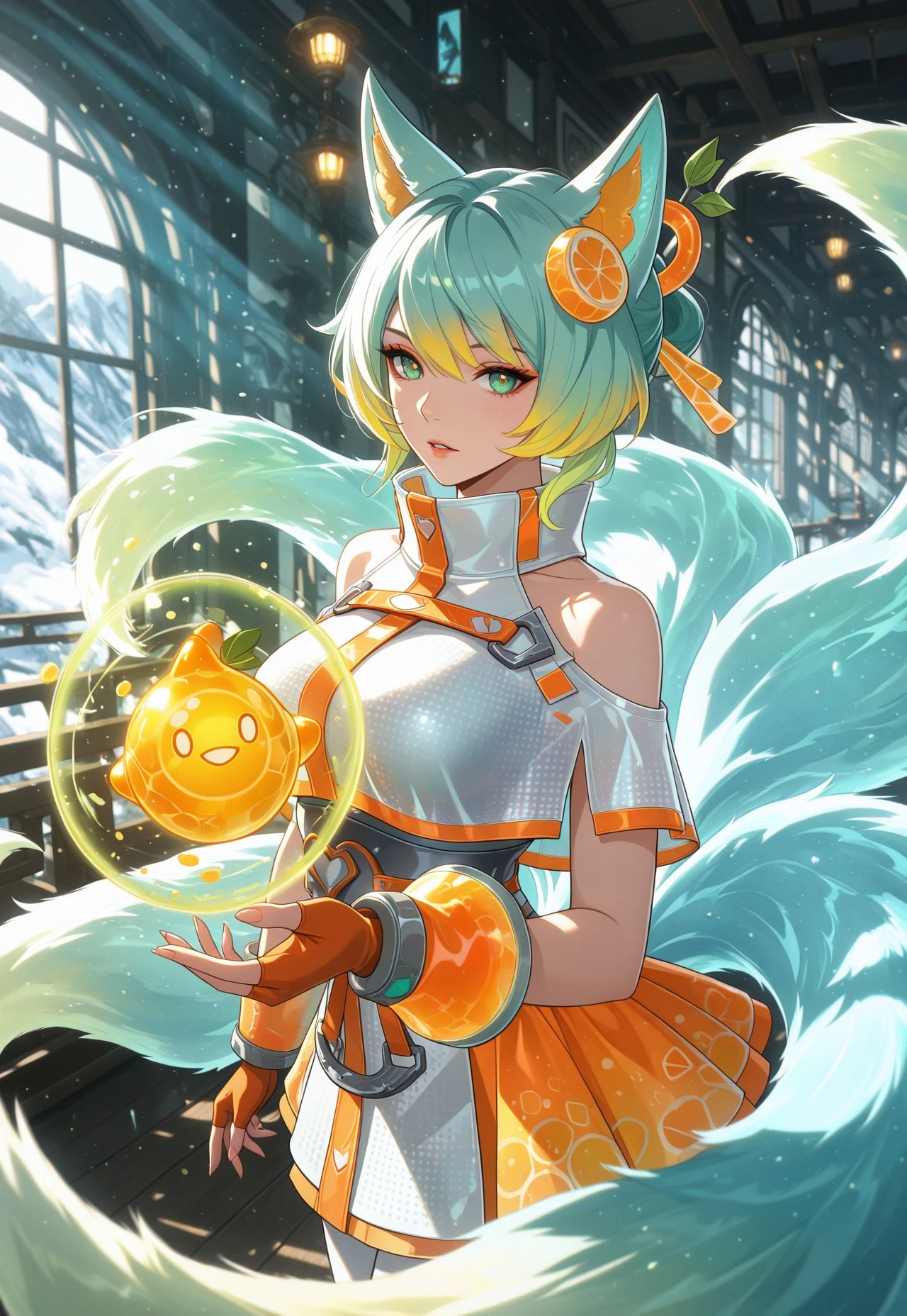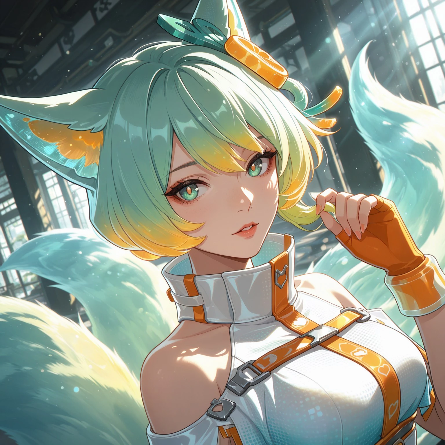 SPahri, short hair, green hair, gradient hair, hair ornament, fox girl, fox tails, multiple tails, fox ears, green eyes, crop top, high collar, cut-out shoulders, multicolored dress, fingerless gloves, asymmetrical legwear, magic ball,