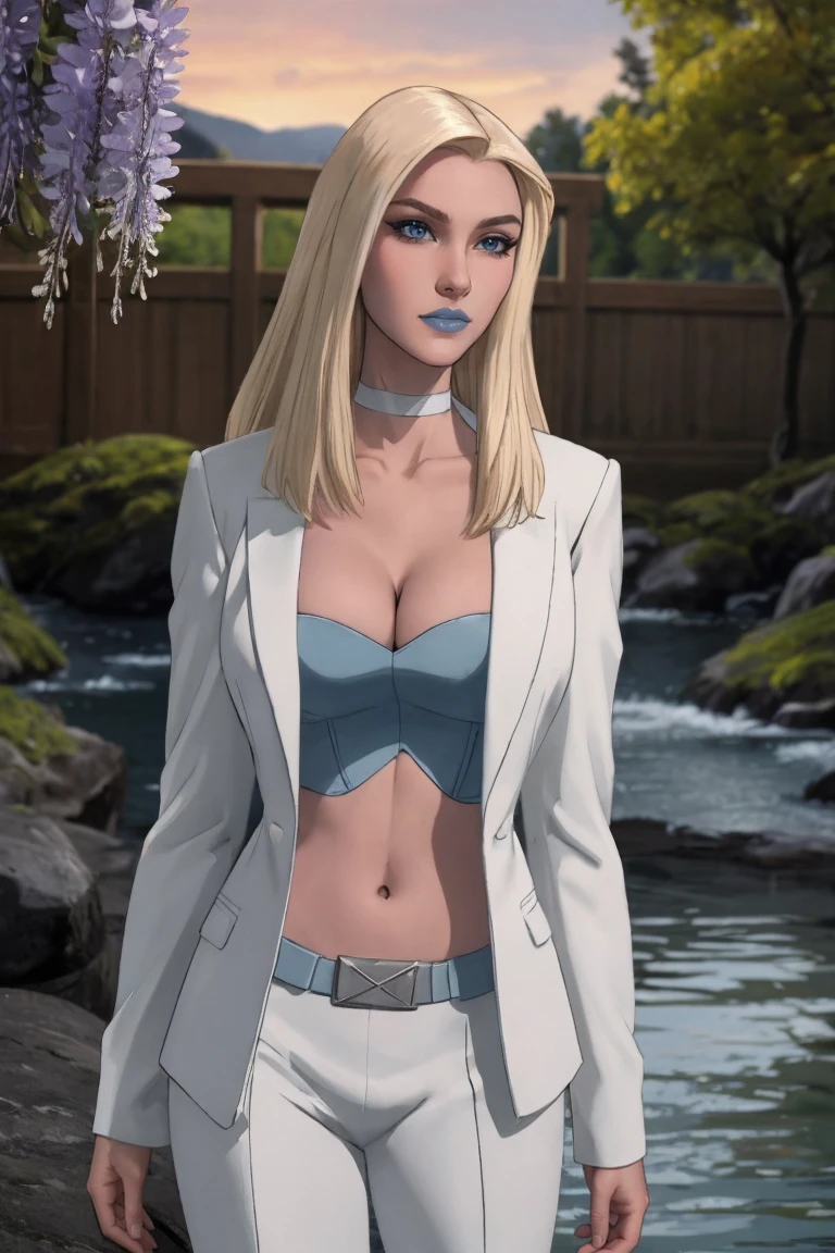cleavage, choker, navel, midriff, white_pants, belt, formal, long sleeves, suit, open clothes, white jacket,