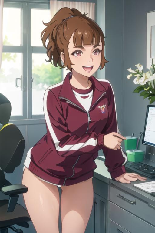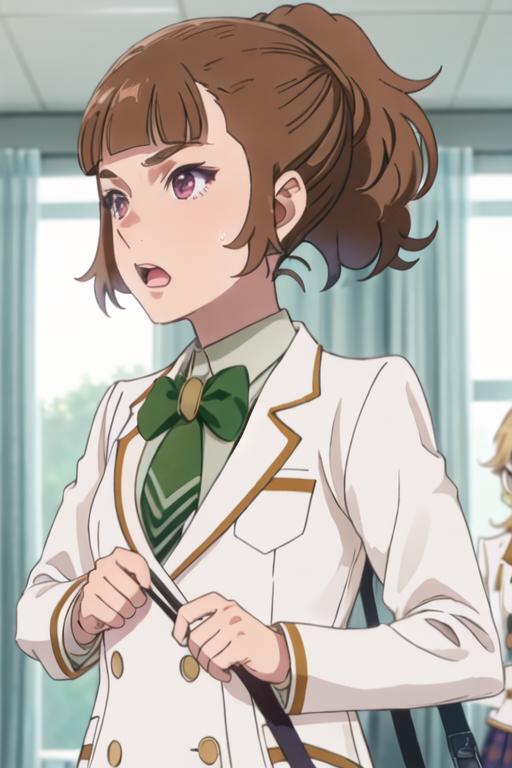 brown_hair, short_hair, ponytail, bangs, open_mouth, brown_eyes