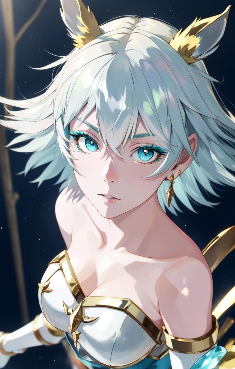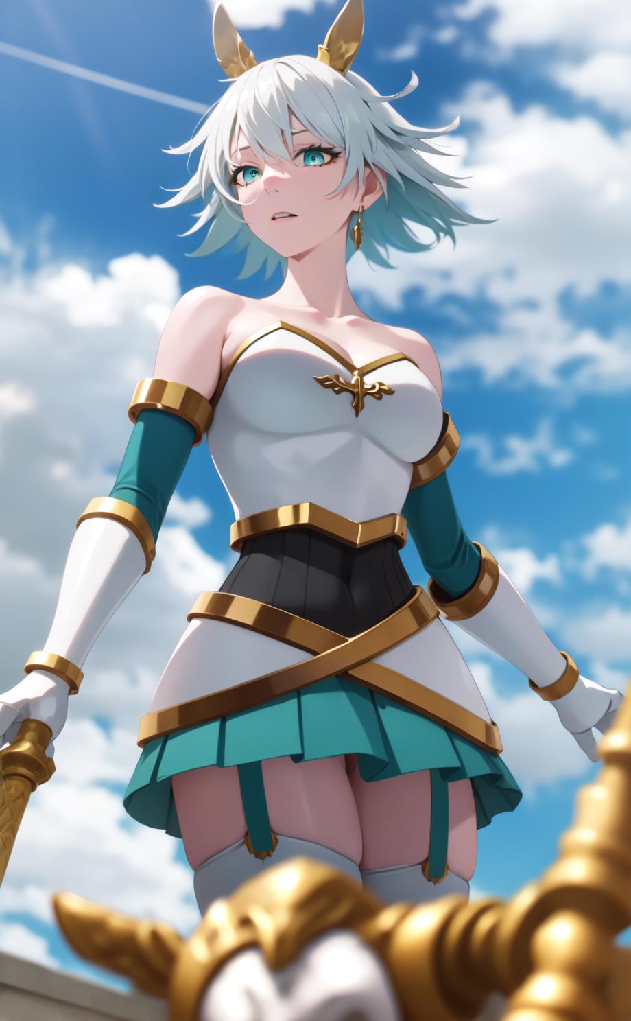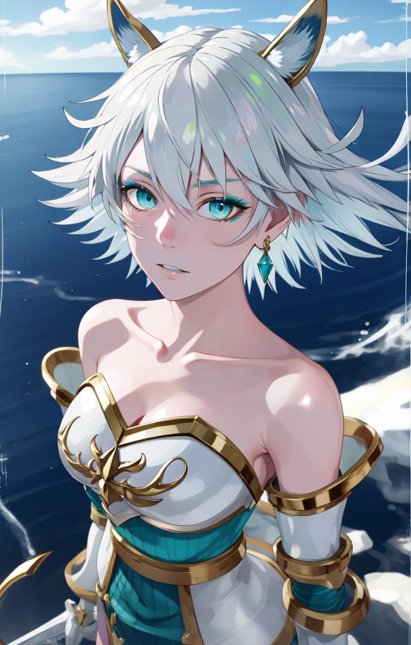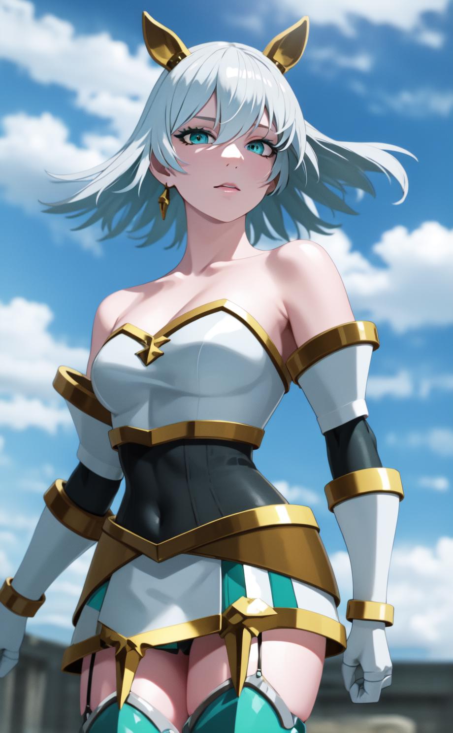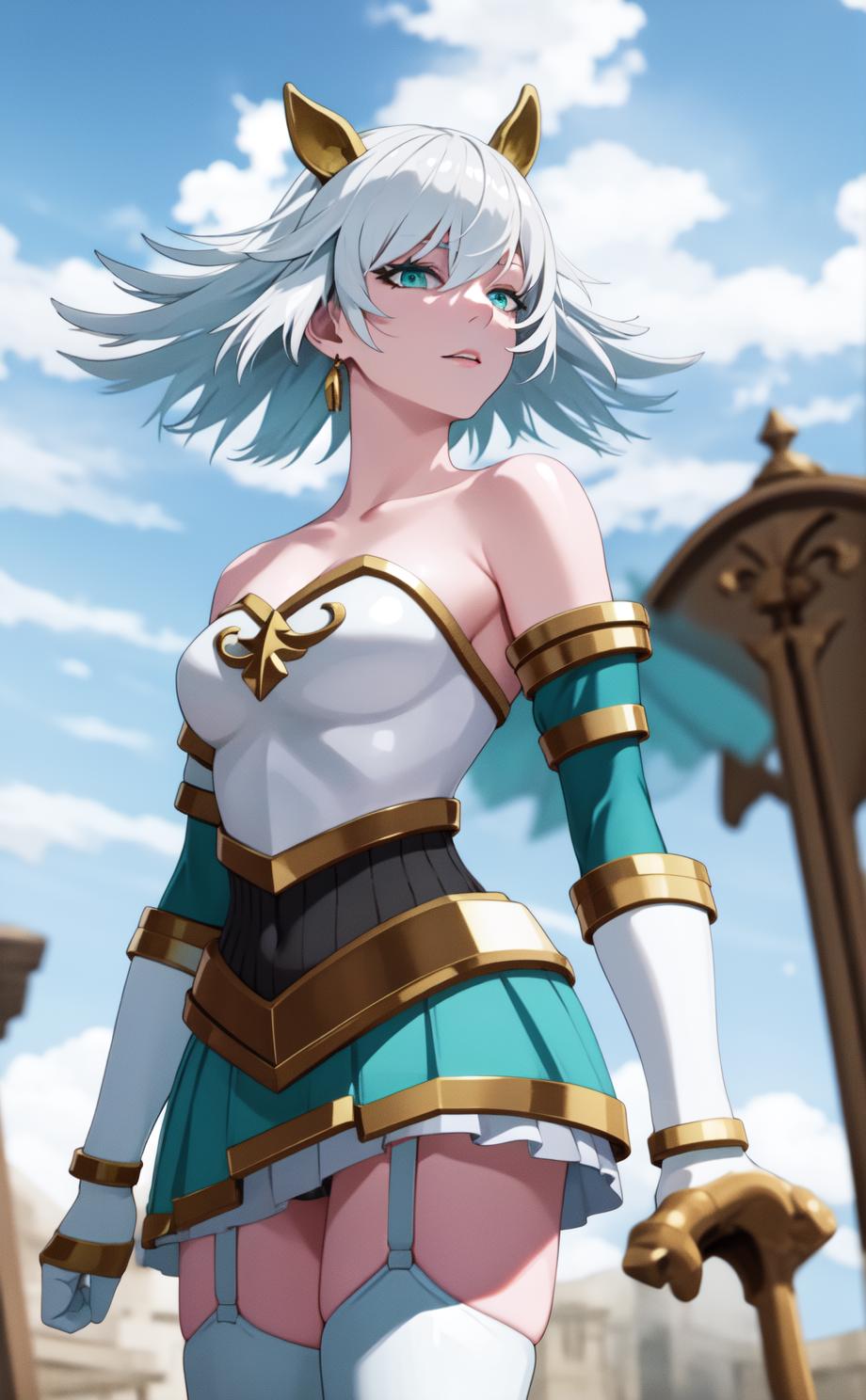 aqua eyes, blue eyeshadow, grey hair, short hair, armor, bare shoulders, garter straps, aqua skirt, thighhighs, tiny fake animal ears,