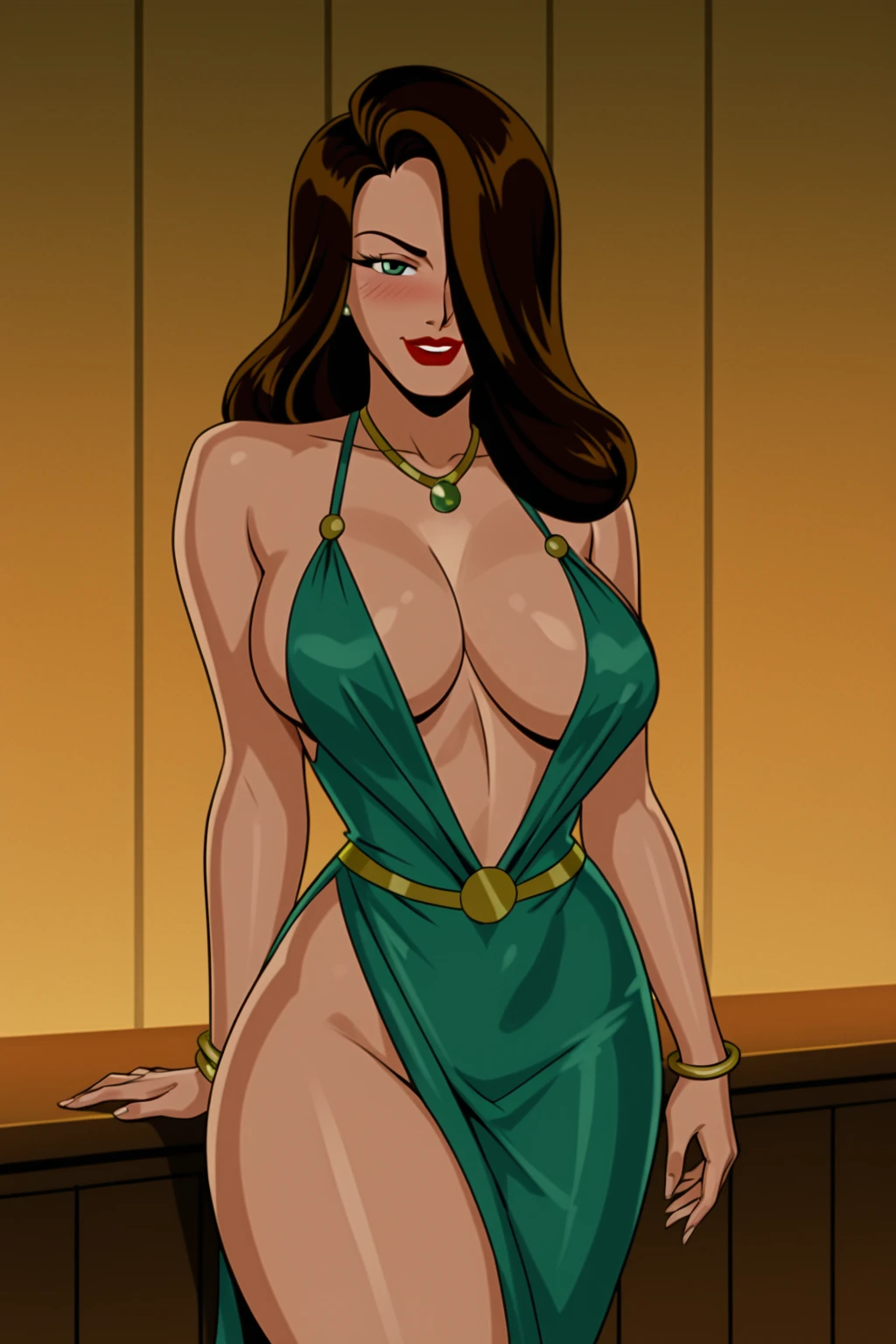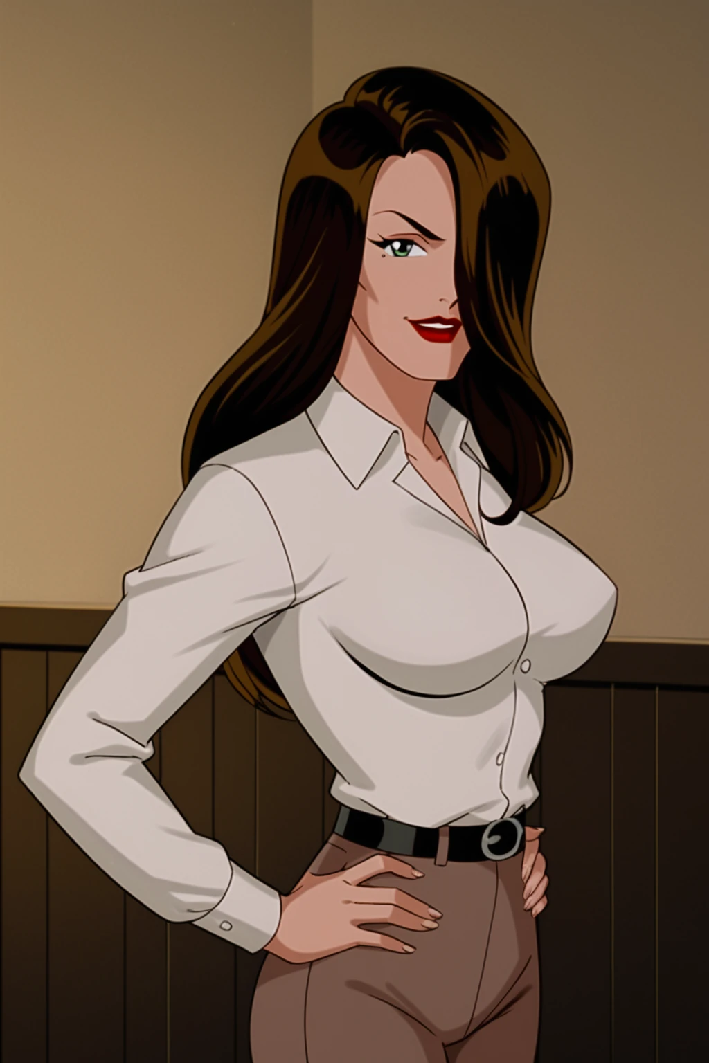 Base Prompt: talia al ghul, long hair, hair over one eye, brown hair, green eyes, lipstick