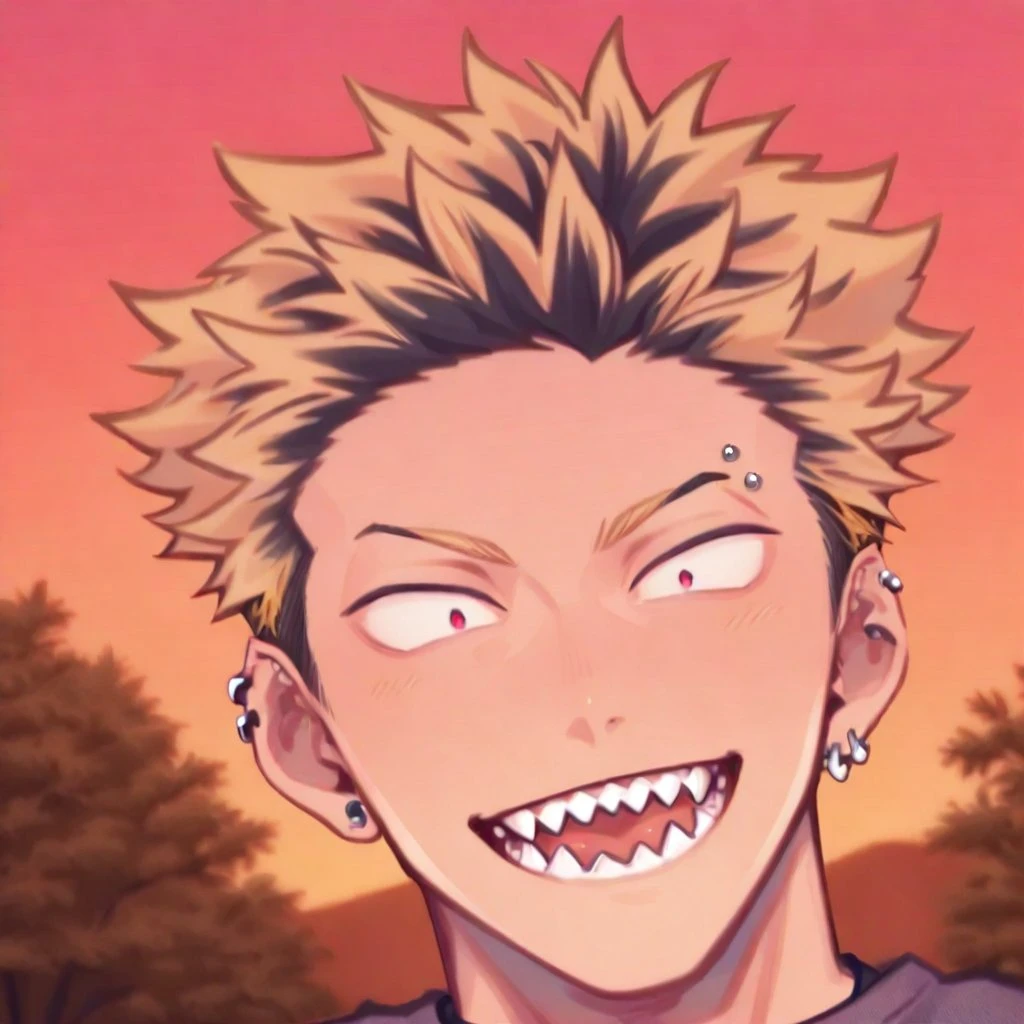 kazuki, blonde hair, black hair, streaked hair, short hair, spiked hair, earrings, piercing, eyebrow piercing, sharp teeth, red eyes, constricted eyes, sanpaku: his facial features...
