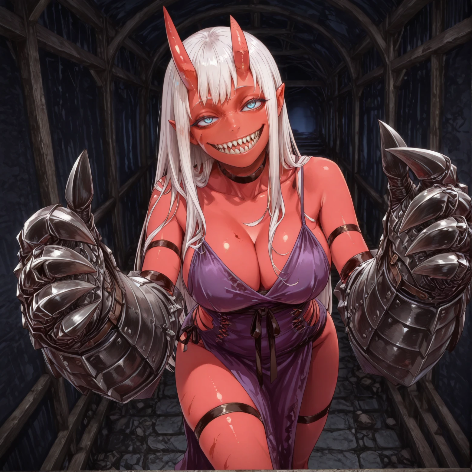 ,gandharva_ogre_thd,oni,white hair,long hair,horns,blue eyes,slited eyes,red skin,sharp teeth