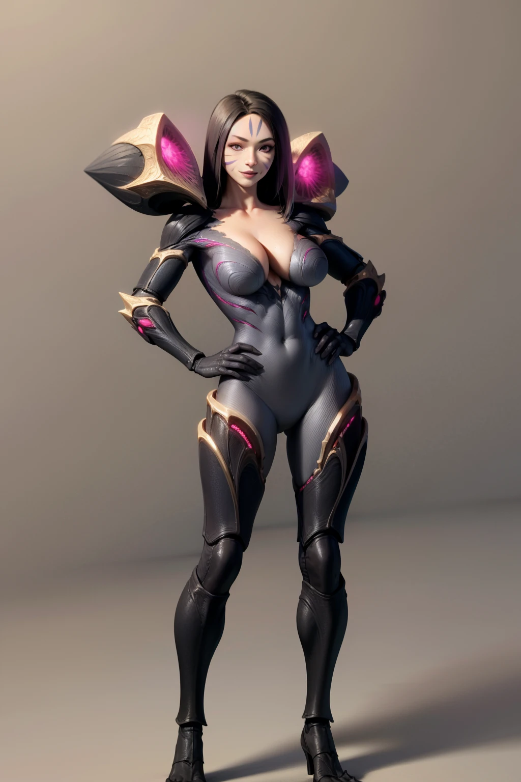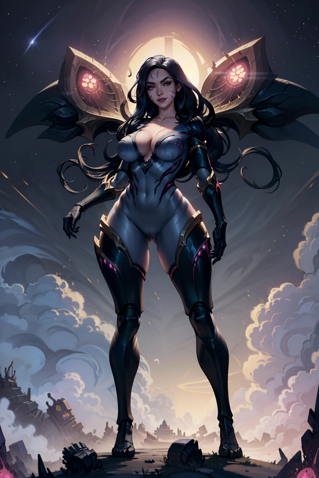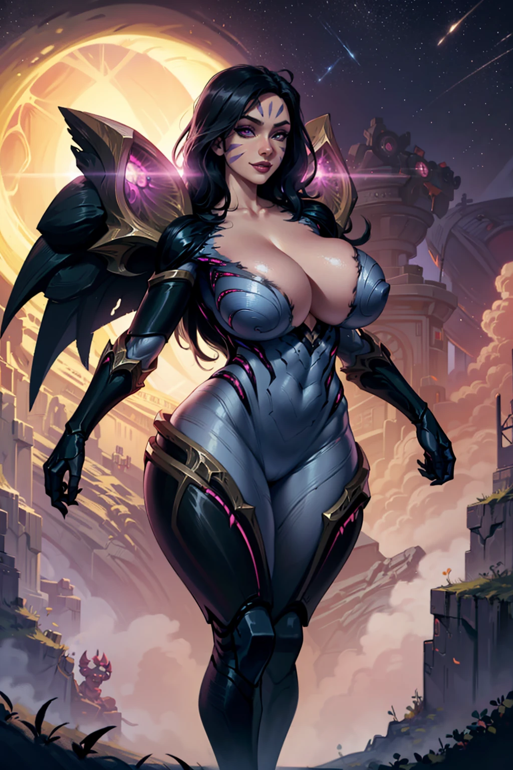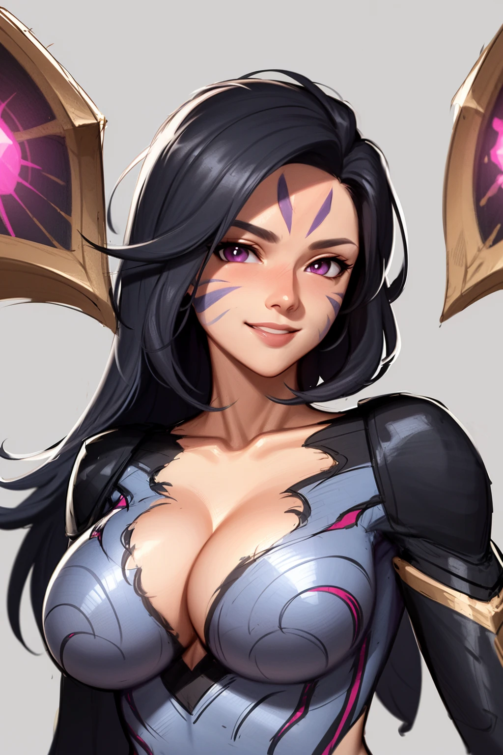 Other prompts: 1girl, black hair, long hair, purple eyes, facial mark, bodysuit, wings