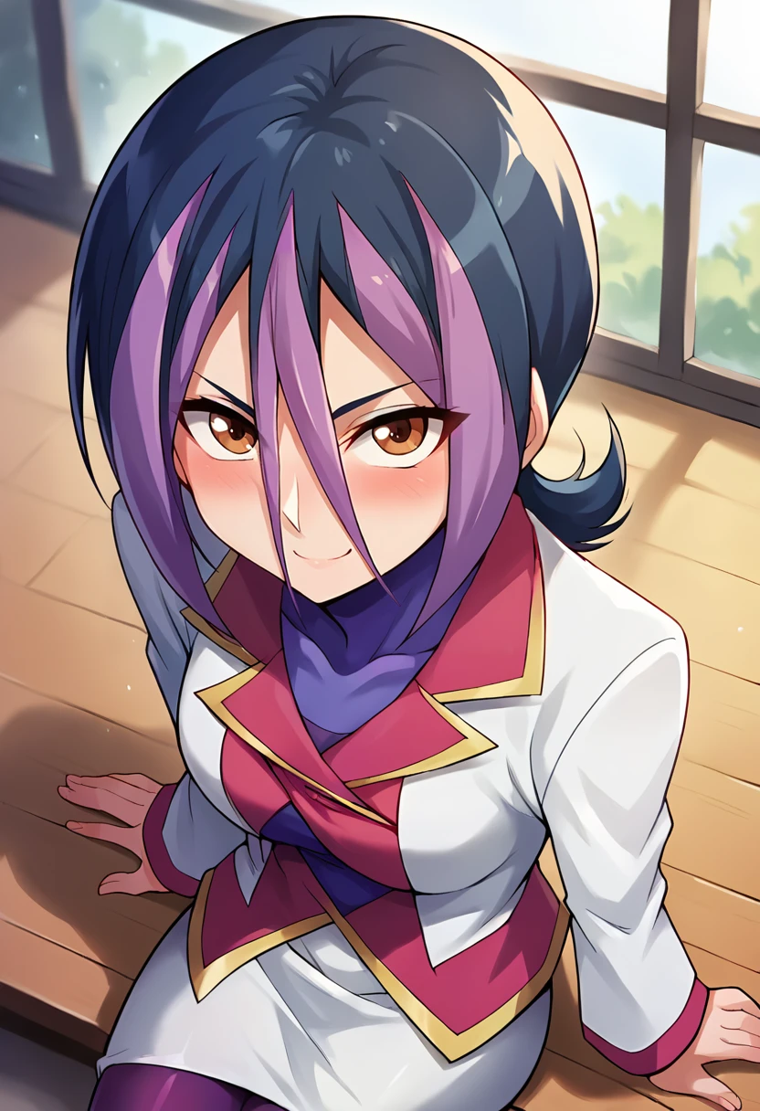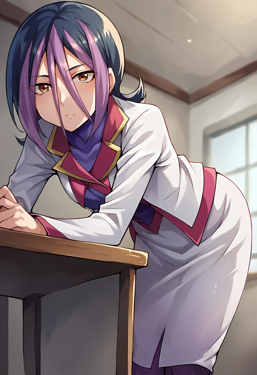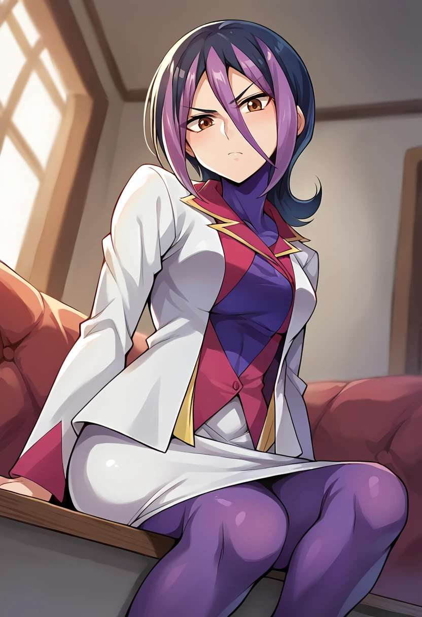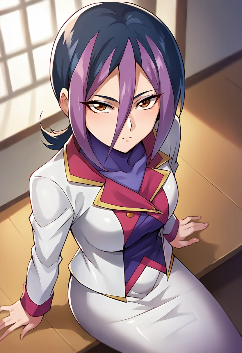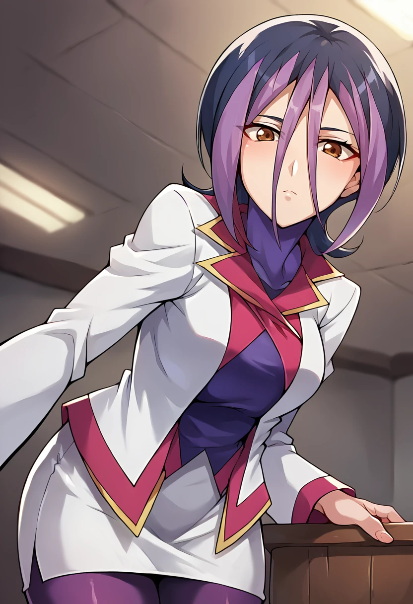 score_9, score_8_up, score_7_up, masterpiece, source_anime, 1girl, solo, ct_droite, brown eyes, short hair, hair between eyes, white blazer, purple bodysuit under clothes, white pencil skirt, purple pantyhose, looking at viewer, indoors, Negative prompt ❌: