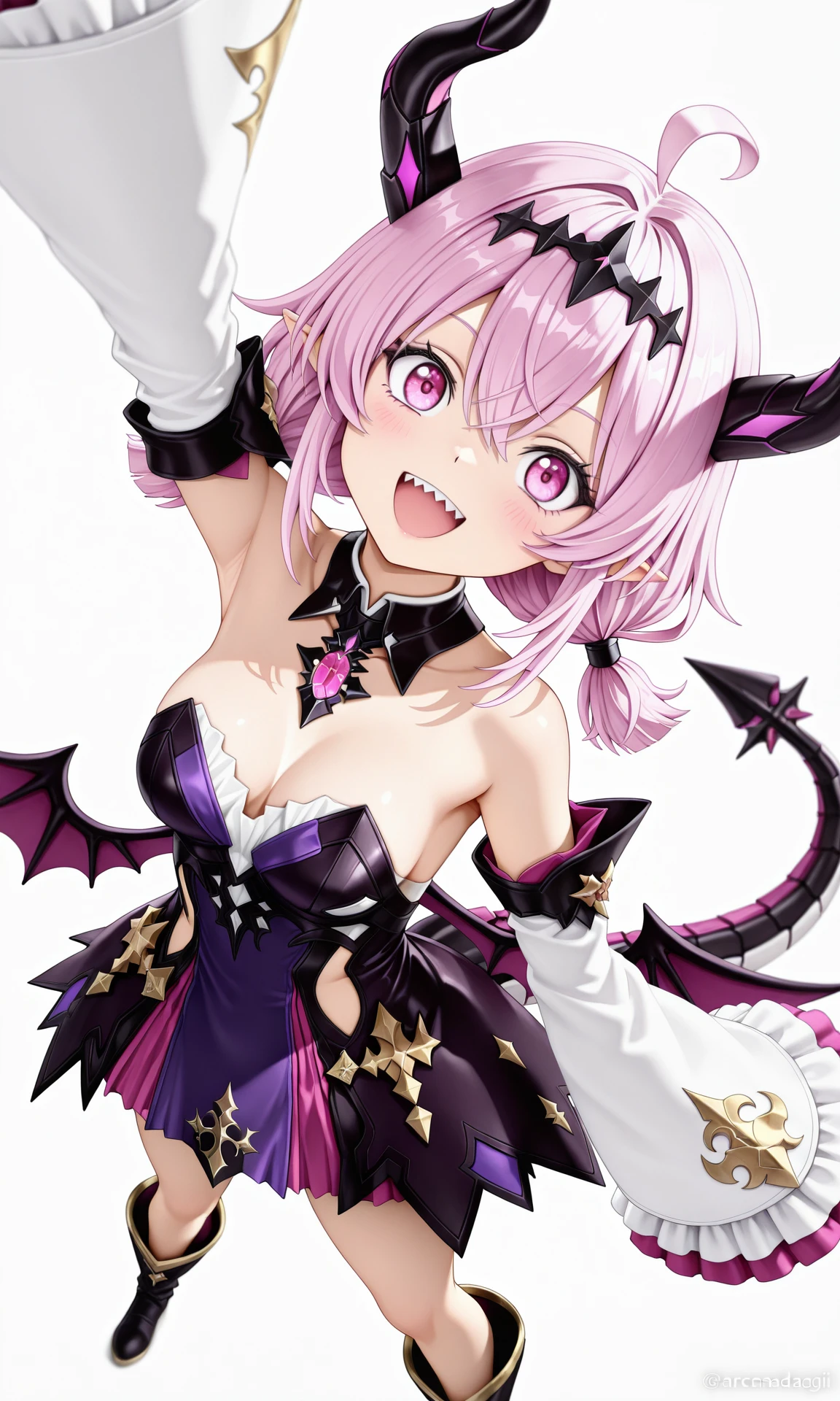 TAGS:loli, horns,pink hair,ahoge,hair_between_eyes,short_hair,low twin braids, pink eyes,black tiara,pointy_ears,