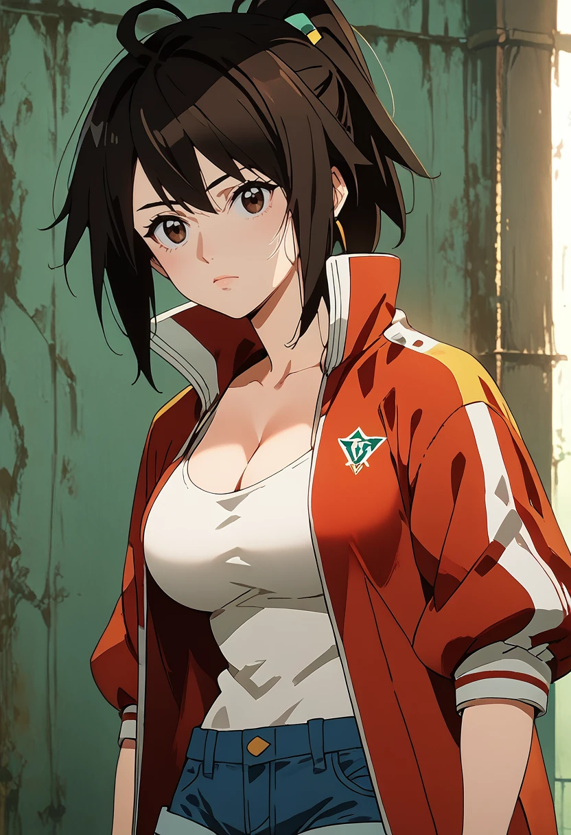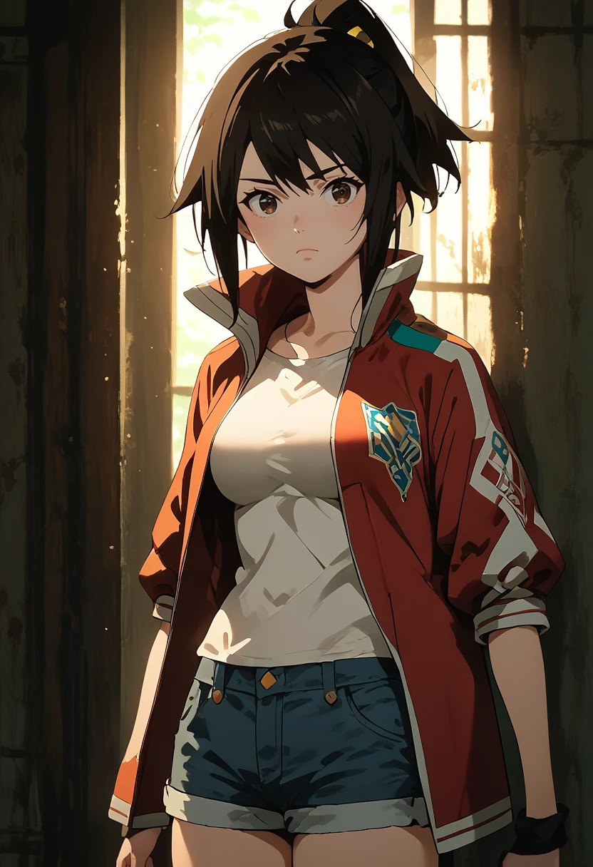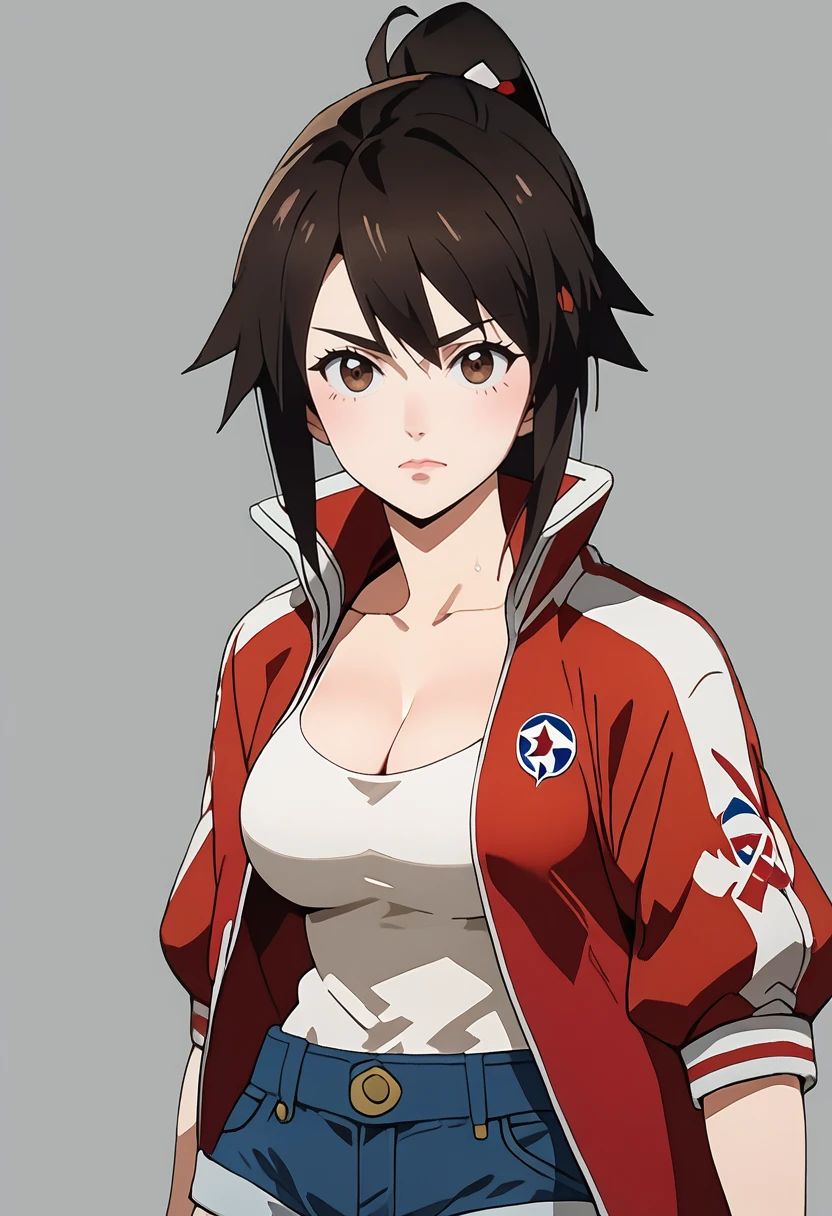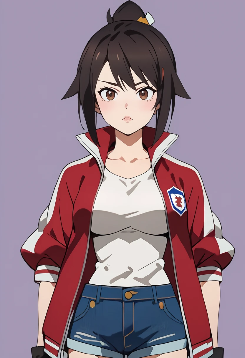rka_bfx, ponytail, black hair, brown eyes, open jacket, denim, short shorts