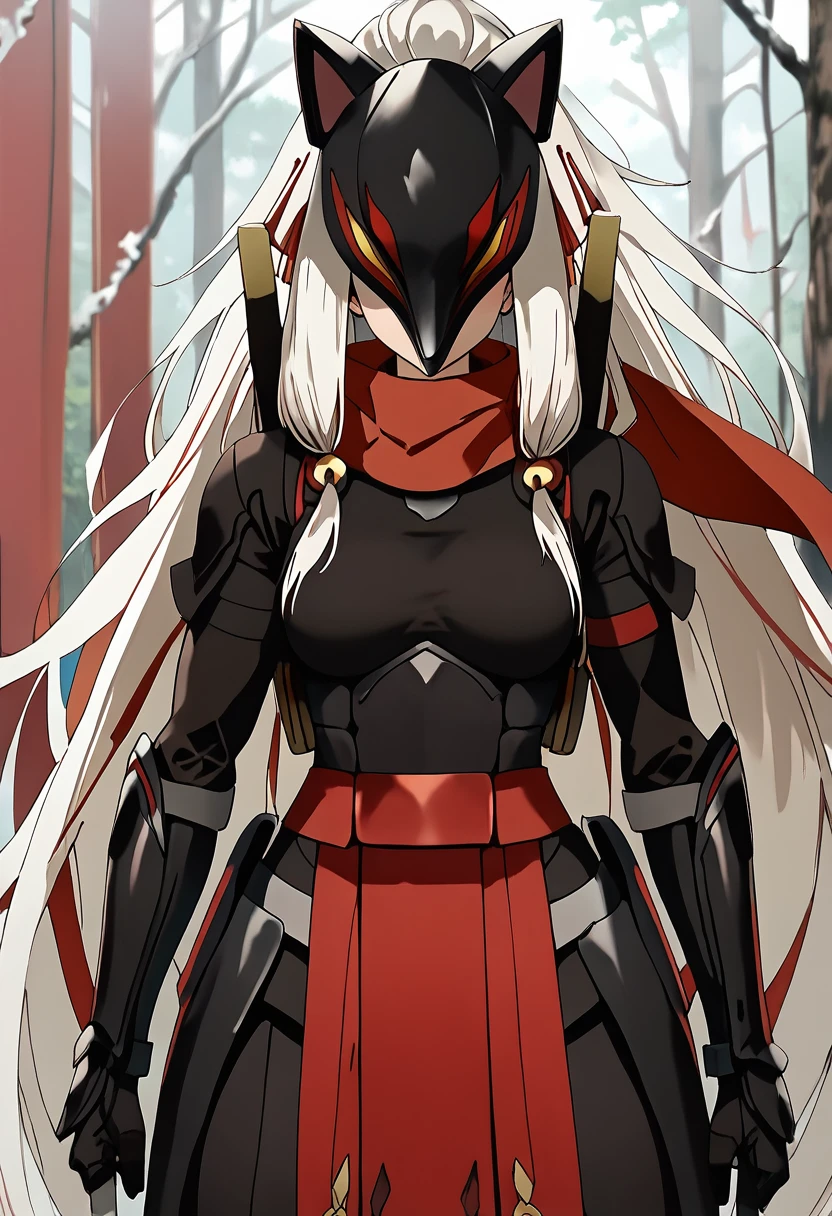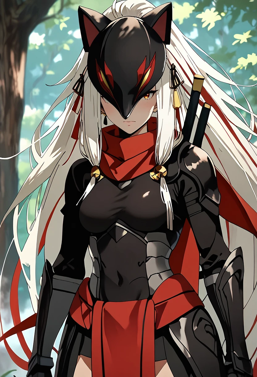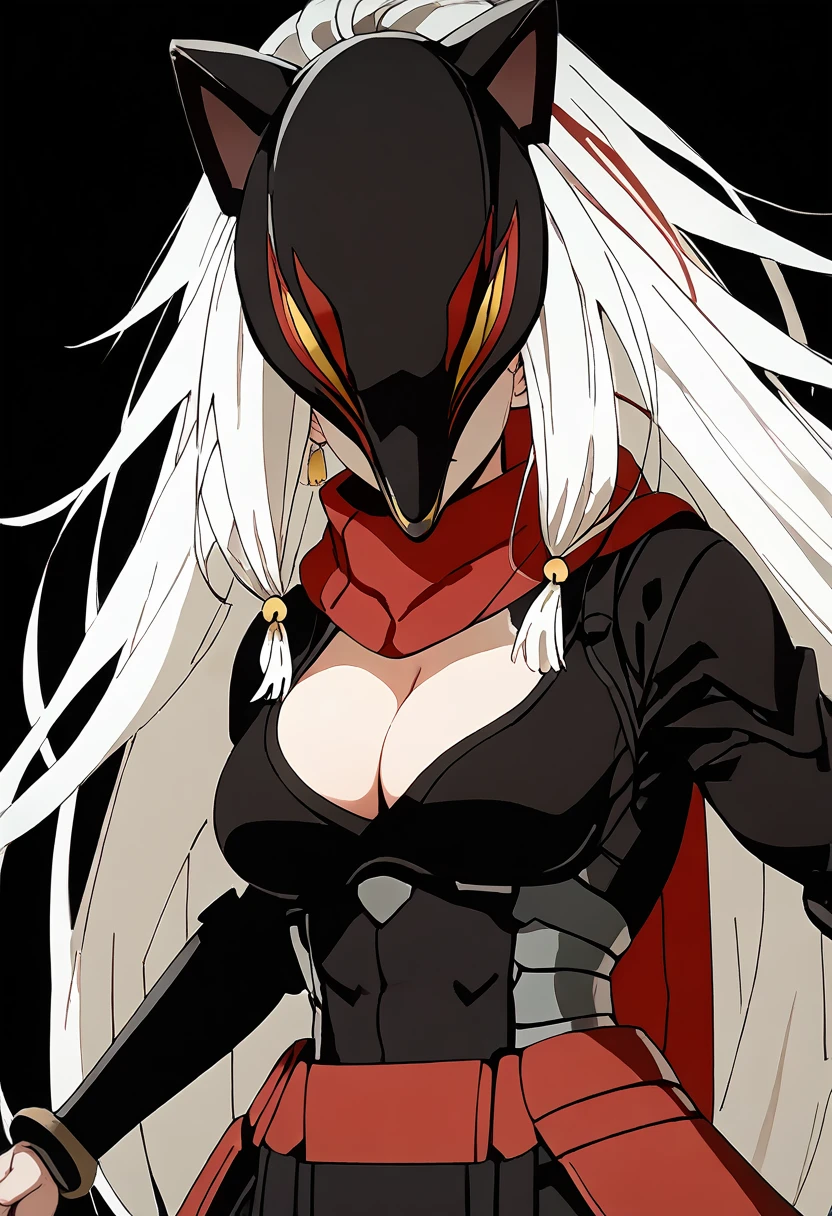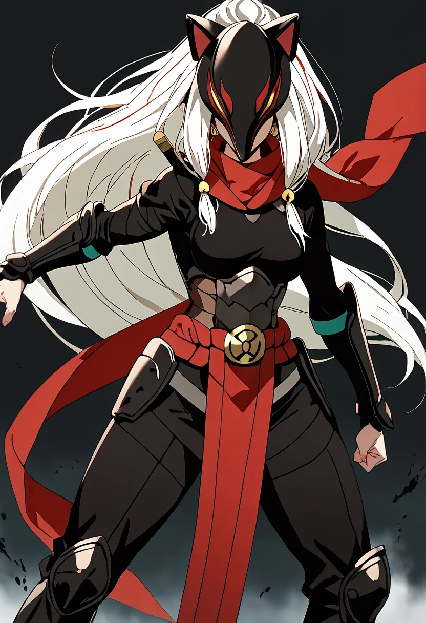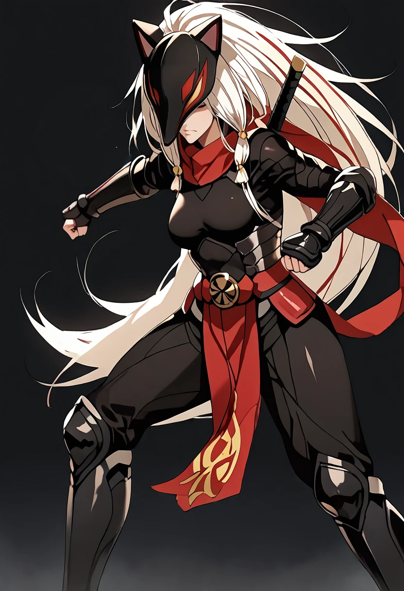 blkfox_bfx, fox mask, sword, very long hair, white hair, red scarf, black armor