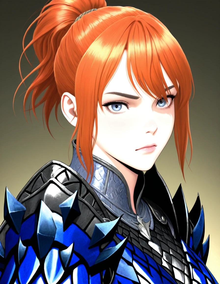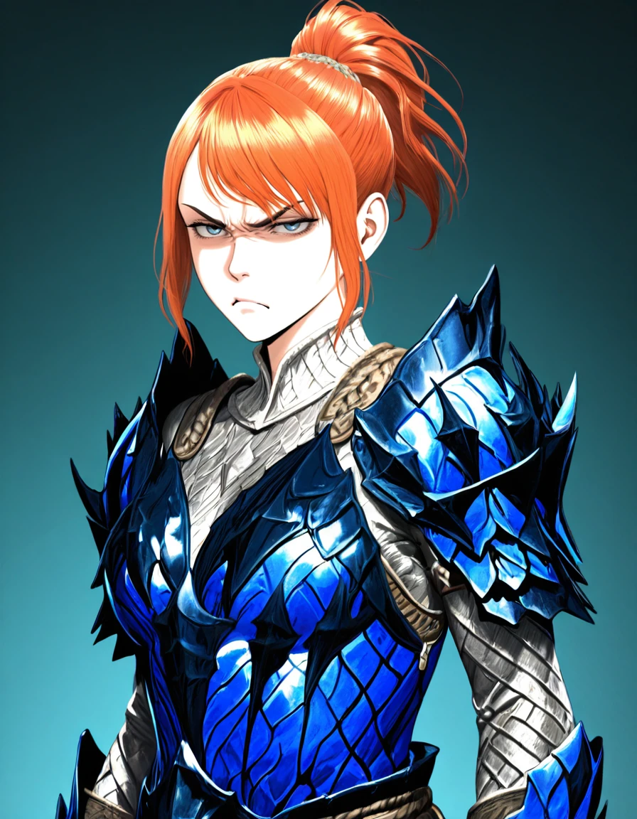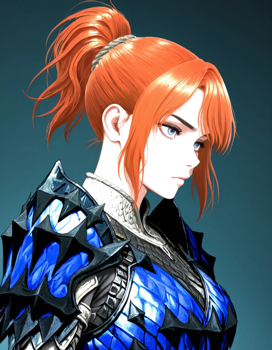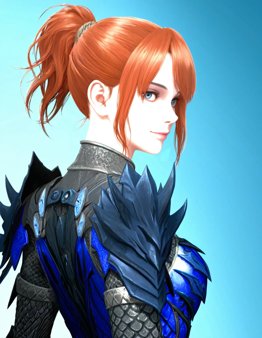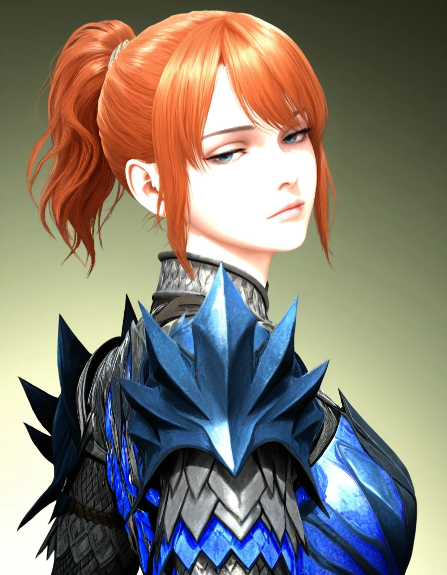 theh00nter, pretty, slender, fit, medium breast, fair complexion, deep-blue eyes, thin eyebrows, ginger hair, short hair, ponytail, high ponytail, side_locks, detailed hair, Rey_Dau_armor, blue_armor, armor_gloves, Inconsistent prompts: