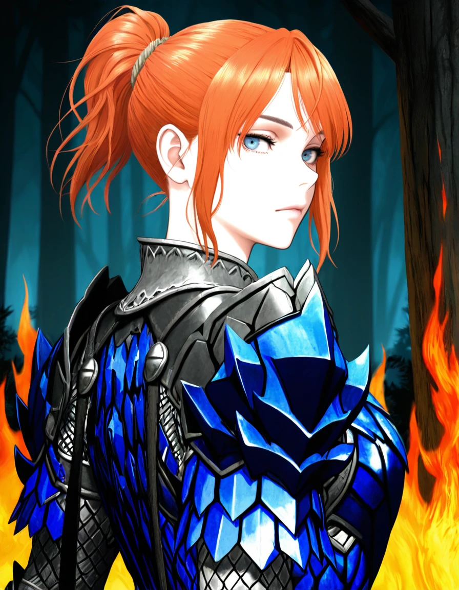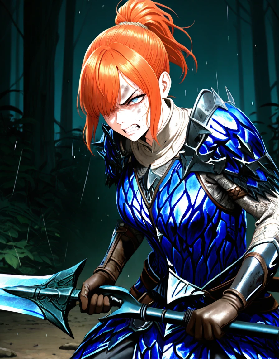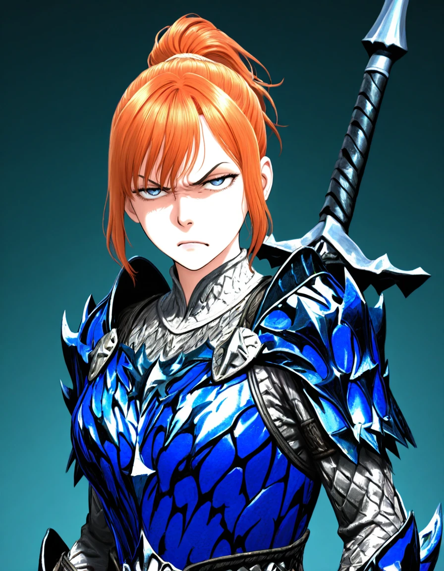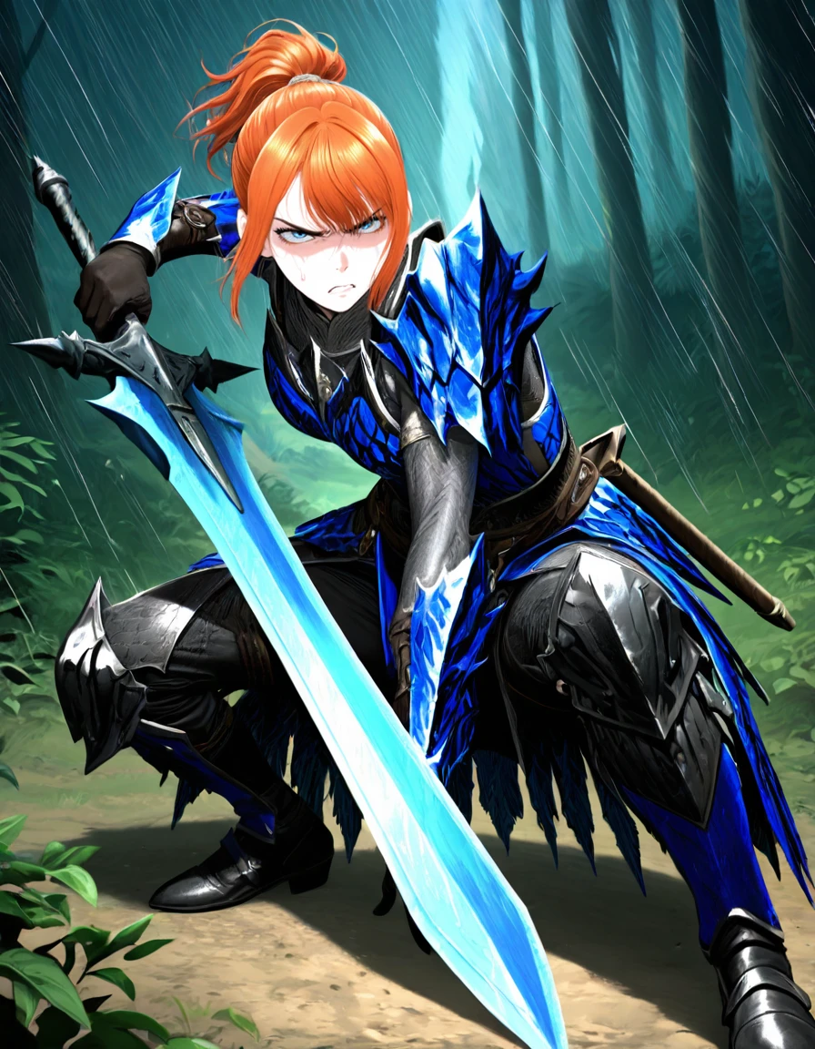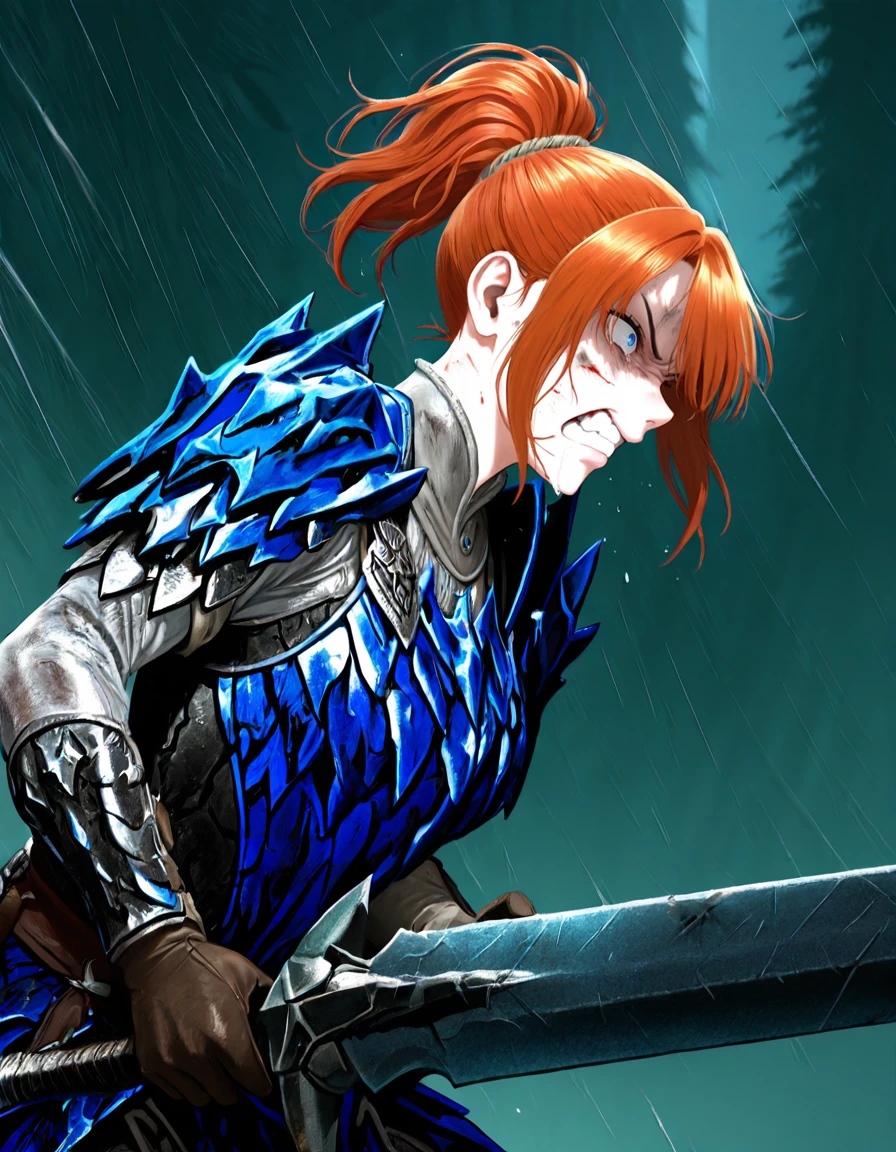 theh00nter, pretty, slender, fit, medium breast, fair complexion, deep-blue eyes, thin eyebrows, ginger hair, short hair, ponytail, high ponytail, side_locks, detailed hair, Rey_Dau_armor, blue_armor, armor_gloves, Inconsistent prompts: