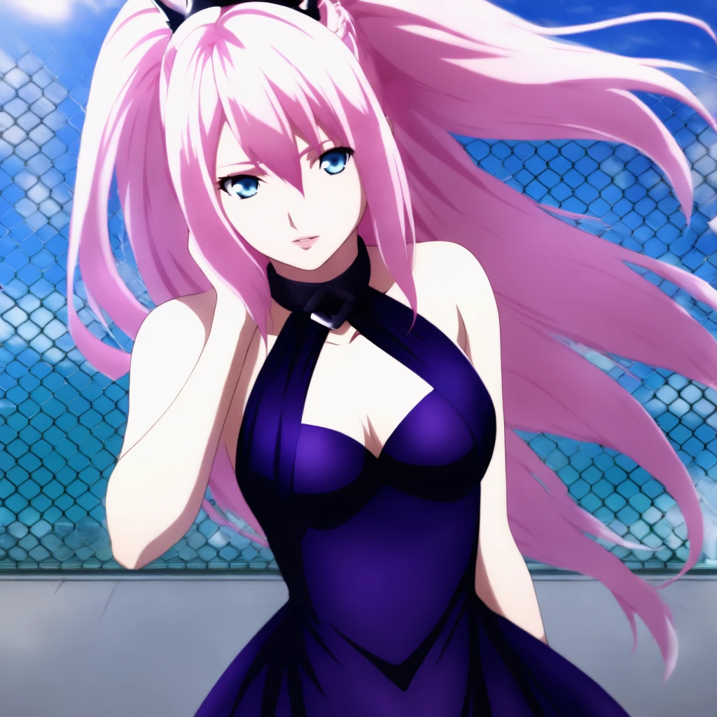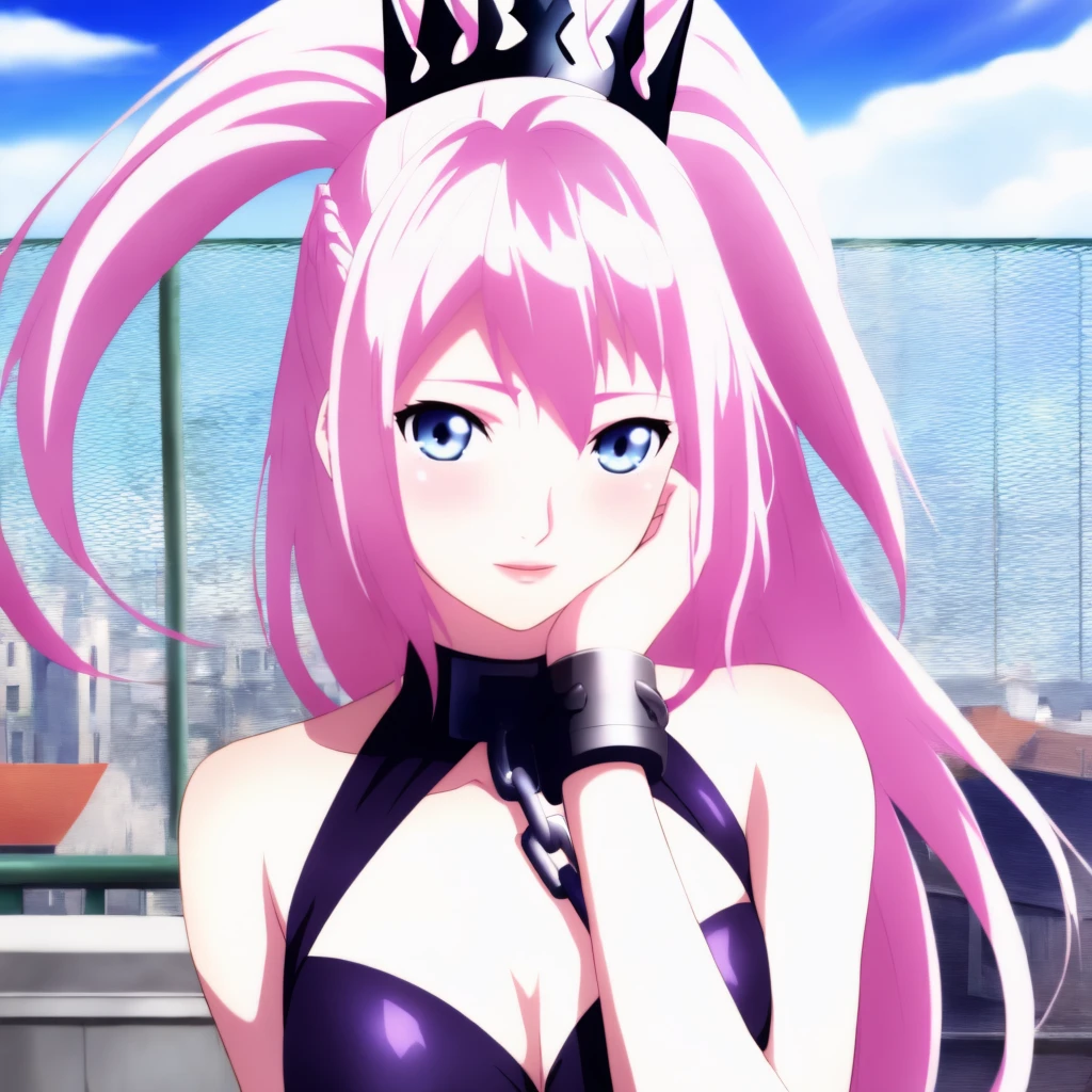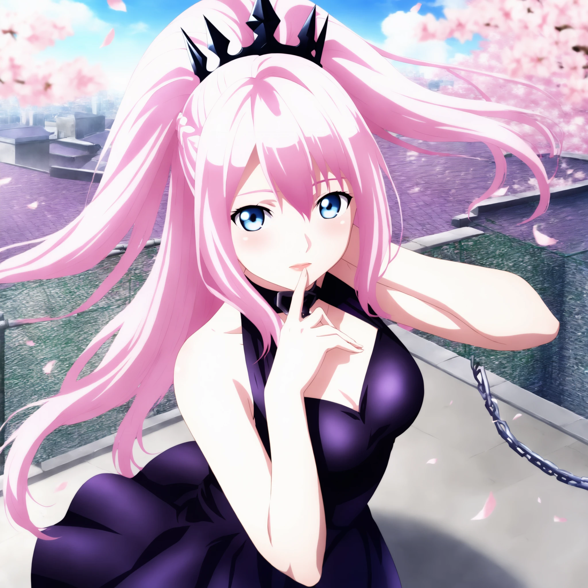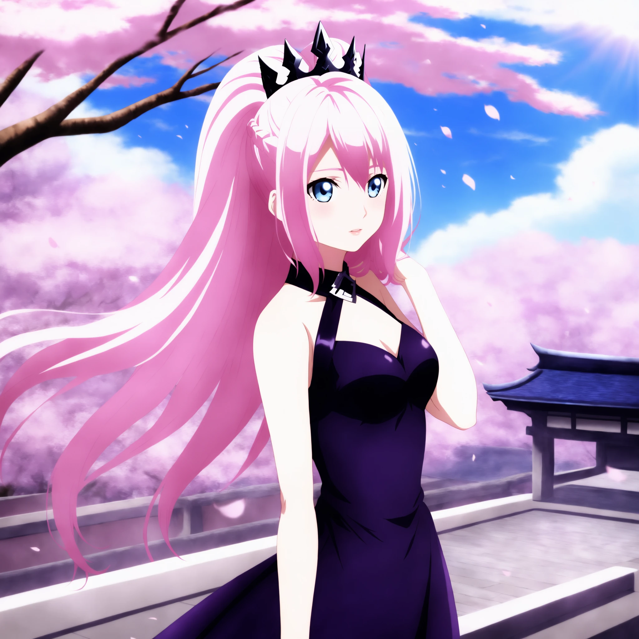 15_Shionne_01B_Black_Dress_ThornsDress, shionne 01b, pale skin, (long hair),pink hair, (blue eyes),medium size,1girl black dress, dress, solo,dress, bare shoulders, sleeveless, sleeveless dress, black crown, purple dress