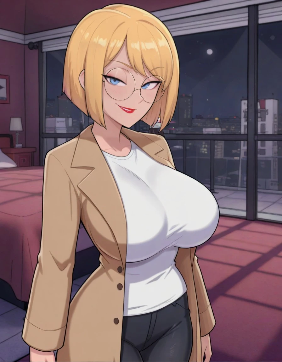 blue eyes blonde hair short hair round glasses black jeans white shirt brown coat