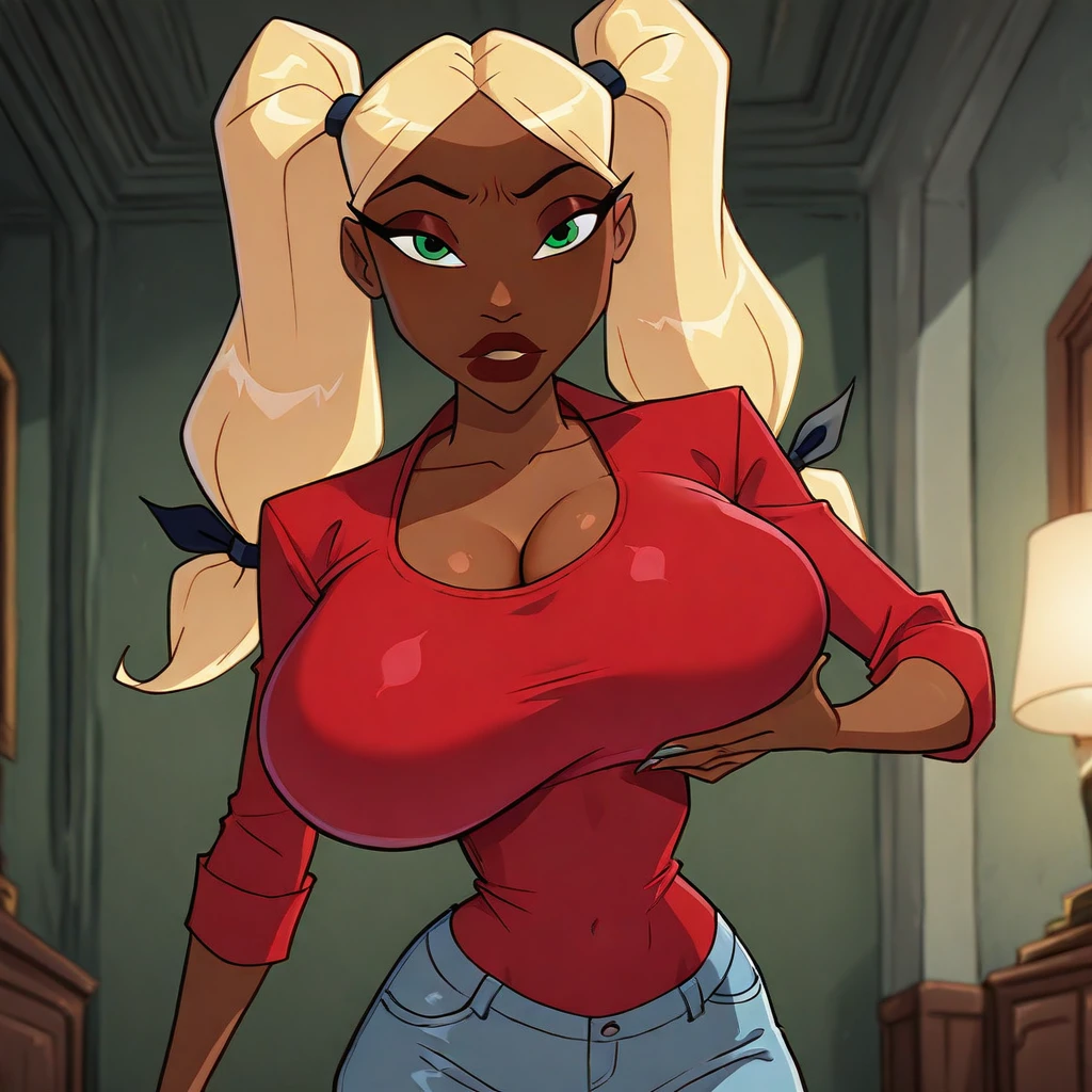 1girl, blonde hair, ((long twin tails)), ((high twin tails)), split bangs face, asian bimbo, slender body, massive , long eyelashes, thick lips. bimbo lips, long eyelashes, , long hair,,green eyes, ((slender face)), , slim waist,, asian, brown skin, epicanthal fold, thai , darkskin, sidelocks,BREAK: