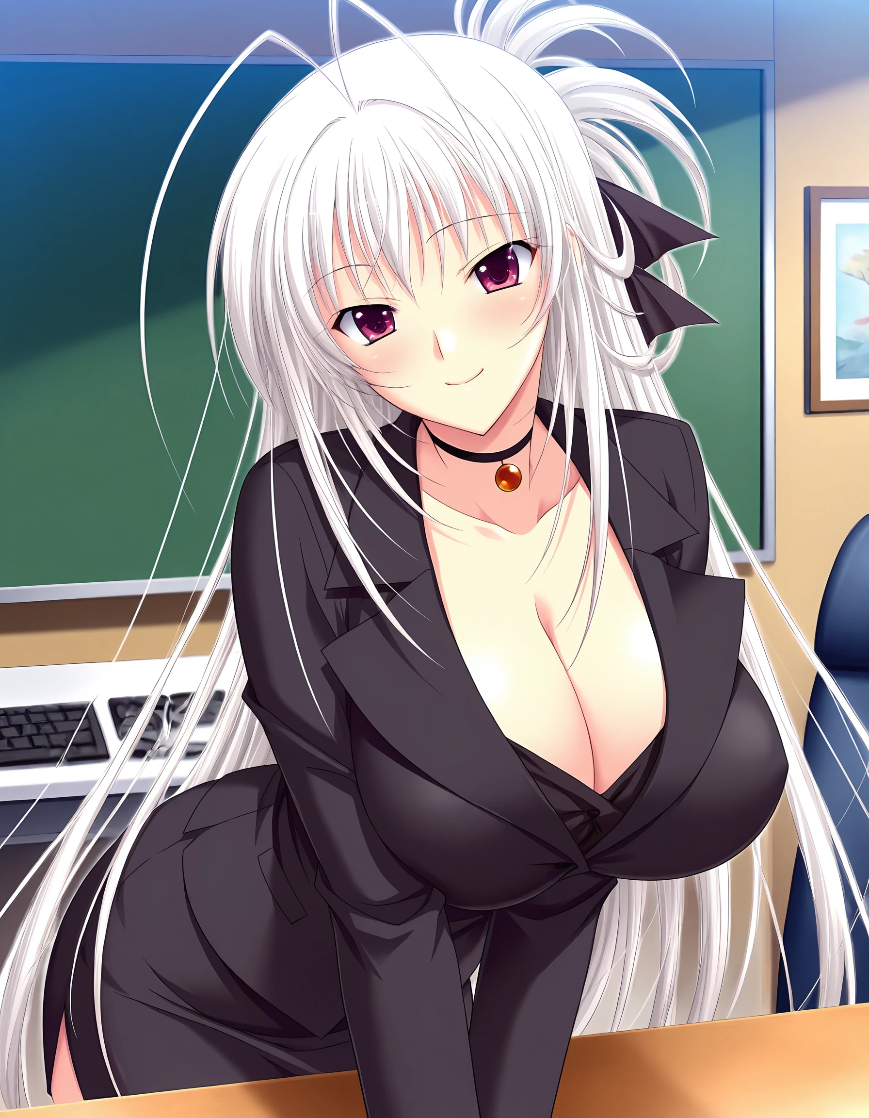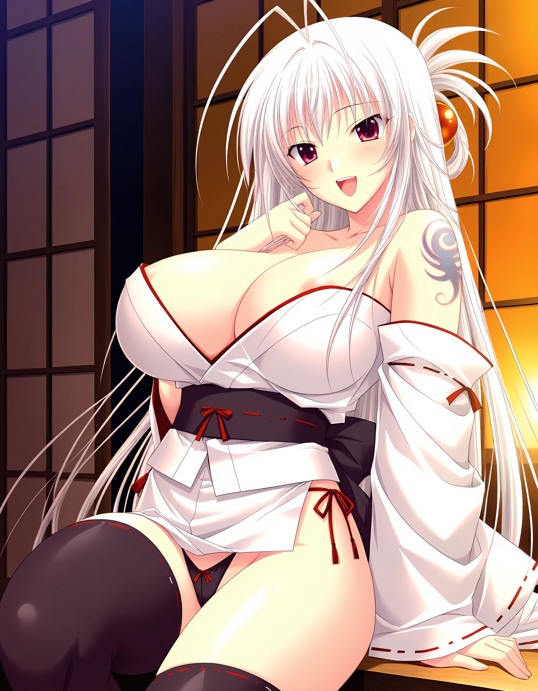 tsukimi-kagamino, white hair, double antenna hair, long hair, half up, rufous eyes, huge breasts,