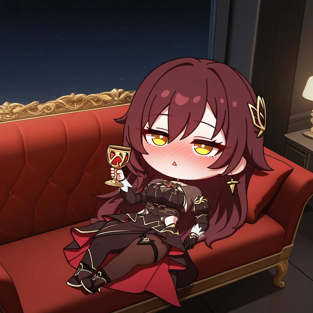 EdenHi3, Fol003, Ed_Drs, brown hair, long hair, yellow eyes brown hair, strap dress, black dress, black choker, long dress, red trim, hair bow, ribbon bow, black bow, elbow gloves, black gloves, bridal gauntlets, bare shoulders, side slit,Disclaimer: No good dataset images for this one as she was wearing a blanket all the time, so not great results.