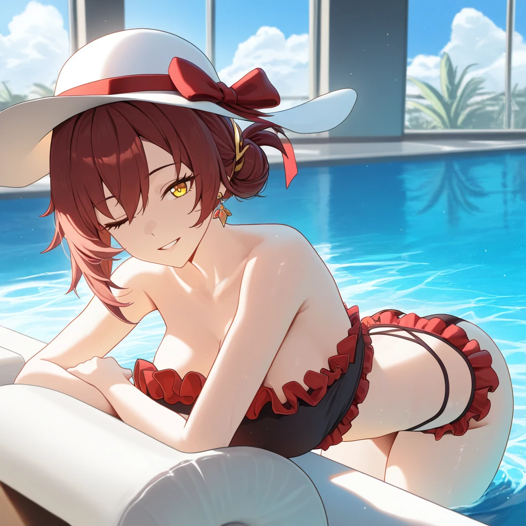 EdenHi3, Fol002, Ed_Bik, brown hair, yellow eyes, short hair, dark brown bikini, strapless bikini, frilled bikini top, multi-strapped bikini bottom, sun hat, white headwear, red bow, hat bow, hair bun, gold hairclip, single earring,Biker Outfit: