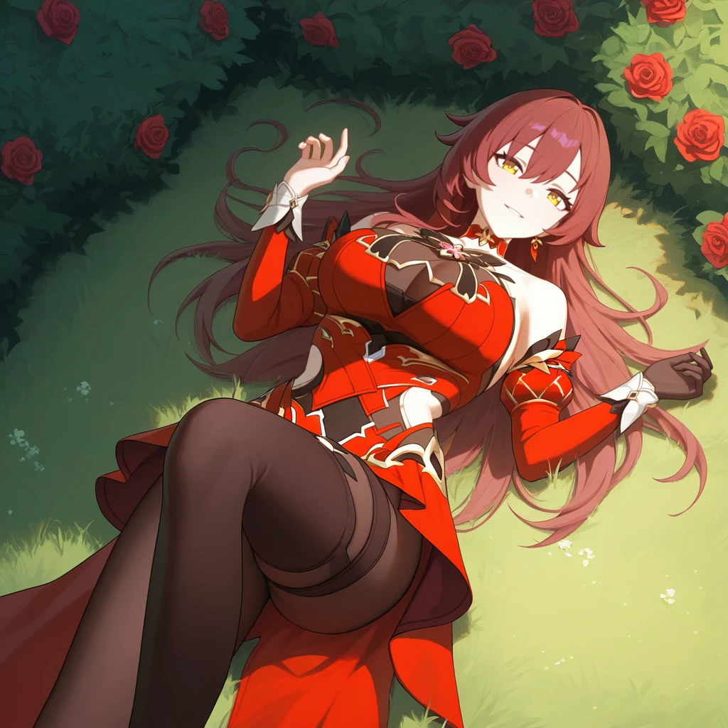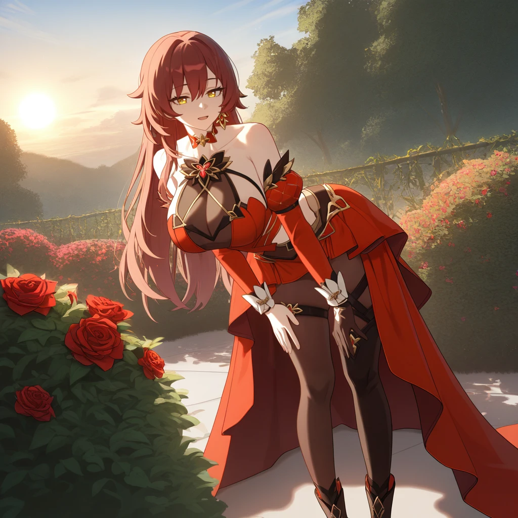 EdenHi3, Fol002, Ed_Alt, brown hair, long hair, yellow eyes, brown bodystocking, see-through cleavage, red dress, sleeveless dress, brooch, jewelry, gold trim, collarbone, red thigh strap, brown pantyhose, single earring, hair ornament, detached juliet sleeves, red sleeves, bare shoulders, white sleeve cuffs, dark brown gloves, single glove, side cutout, red choker, clothing cutout, cleavage cutout, single thigh boot, dark brown footwear, ankle boots, dark brown thigh strap, two-sided skirt, red waist cape, waist cape, layered legwear,Merch Swimsuit Outfit: