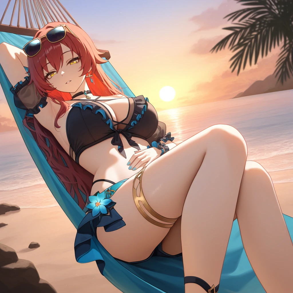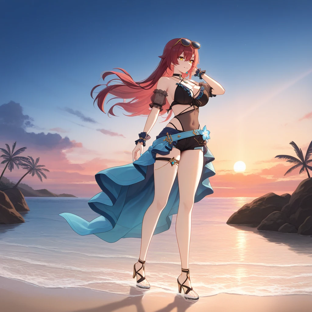 EdenHi3, Fol001, Ed_Swm, brown hair, long hair, yellow eyes see-through midriff, covered navel, panty straps, micro shorts, black shorts, thighlet, frilled sarong, see-through, blue sarong, two-sided sarong, light blue flower, light blue belt, loose belt, anchor ornament, frilled bikini, criss-cross halter, front-tie bikini top, black ribbon, black bikini, necklace, pendant choker, single earring, puffy detached sleeves, see-through sleeves, frilled sleeves, frilled wrist cuffs, eyewear on head, sunglasses, dark blue wrist cuffs, strappy heels, cross-laced sandals, high heel sandals,Red Dress Recolor Outfit: