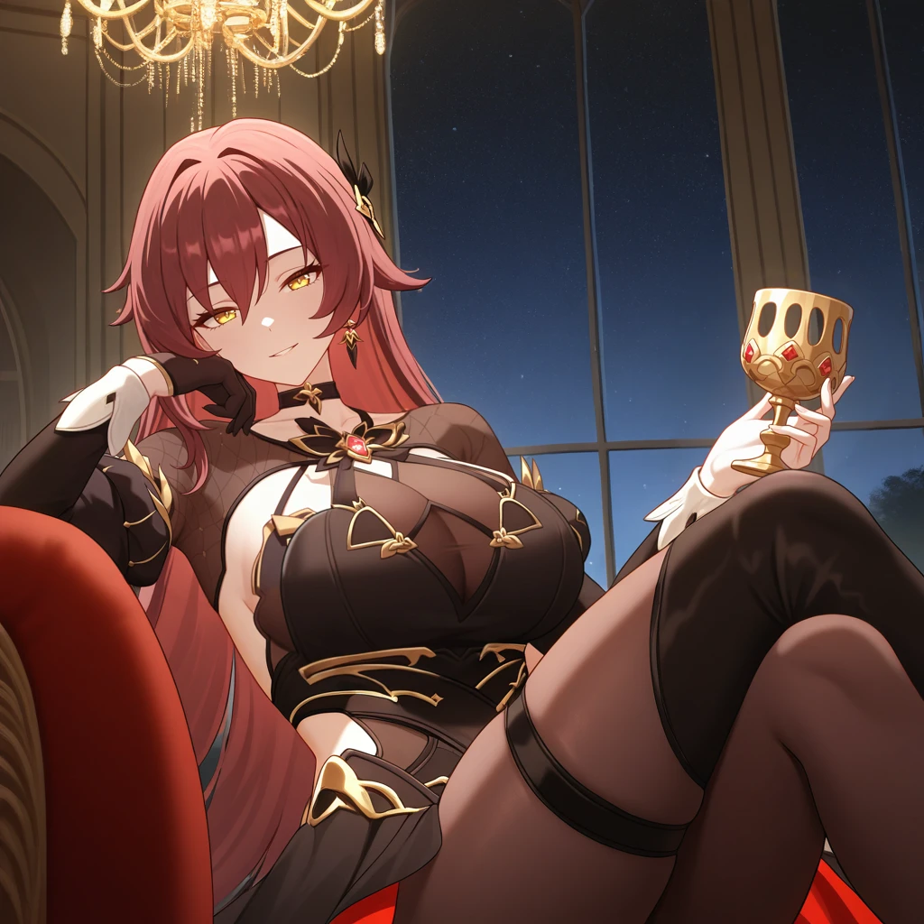 Eden_Red, red dress, black gloves, single glove, long sleeves, pantyhose, clothing cutout, cleavage, earringsAnime Outfit:
