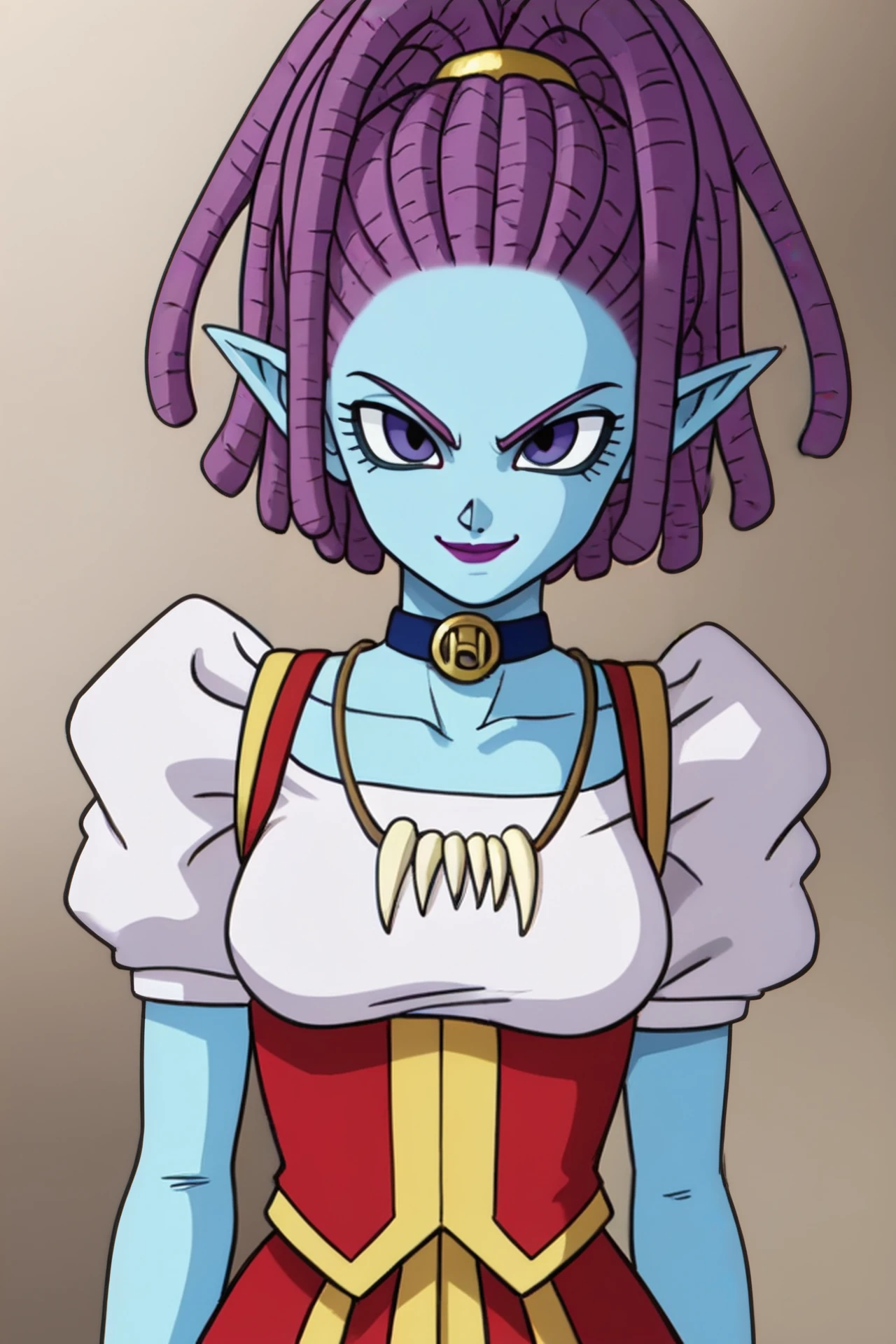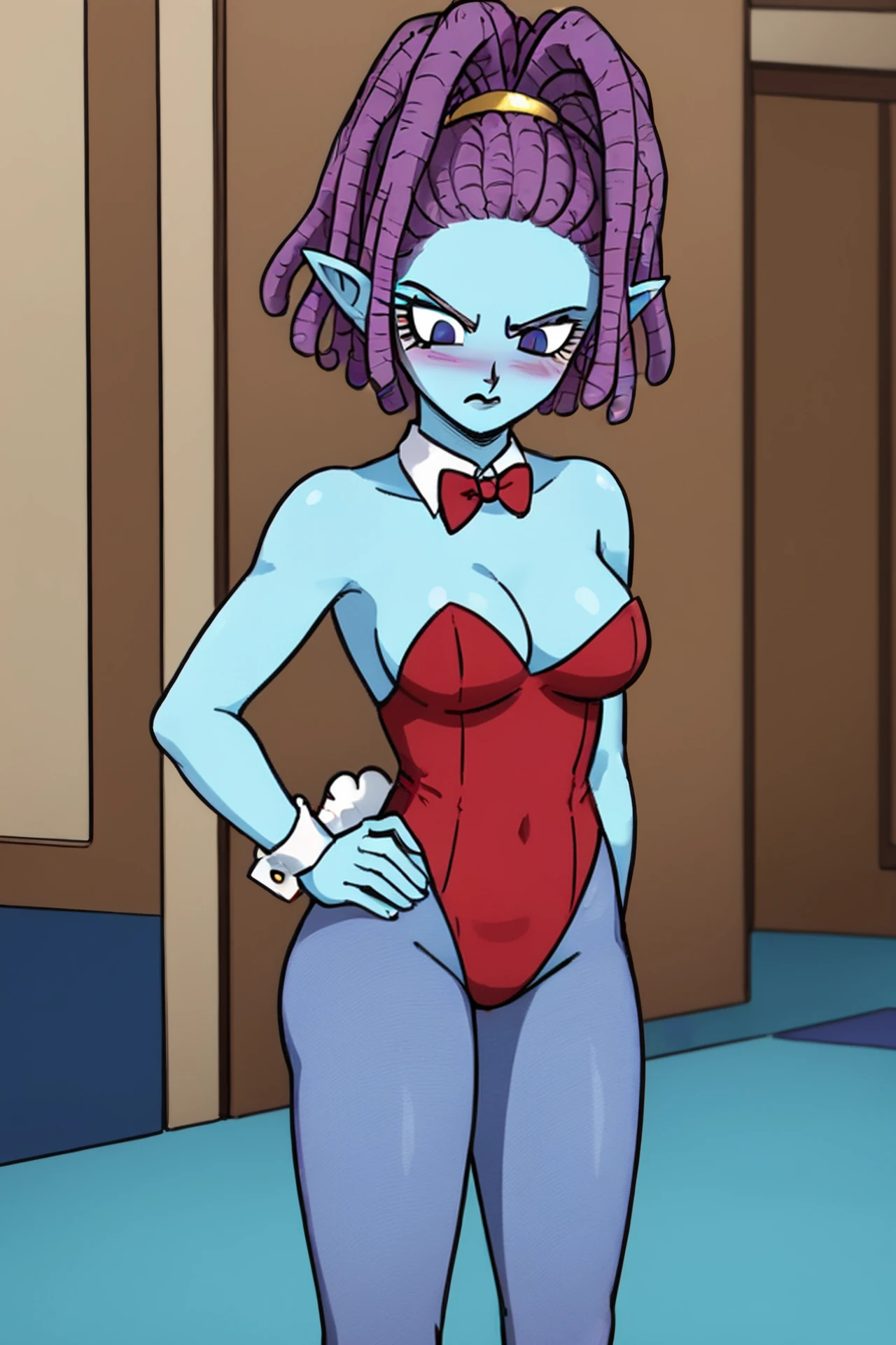mackidbs, purple lips, purple eyes, purple hair, blue skin, dreadlocks, pointy ears, tied-up hair, snake hair, ponytail,