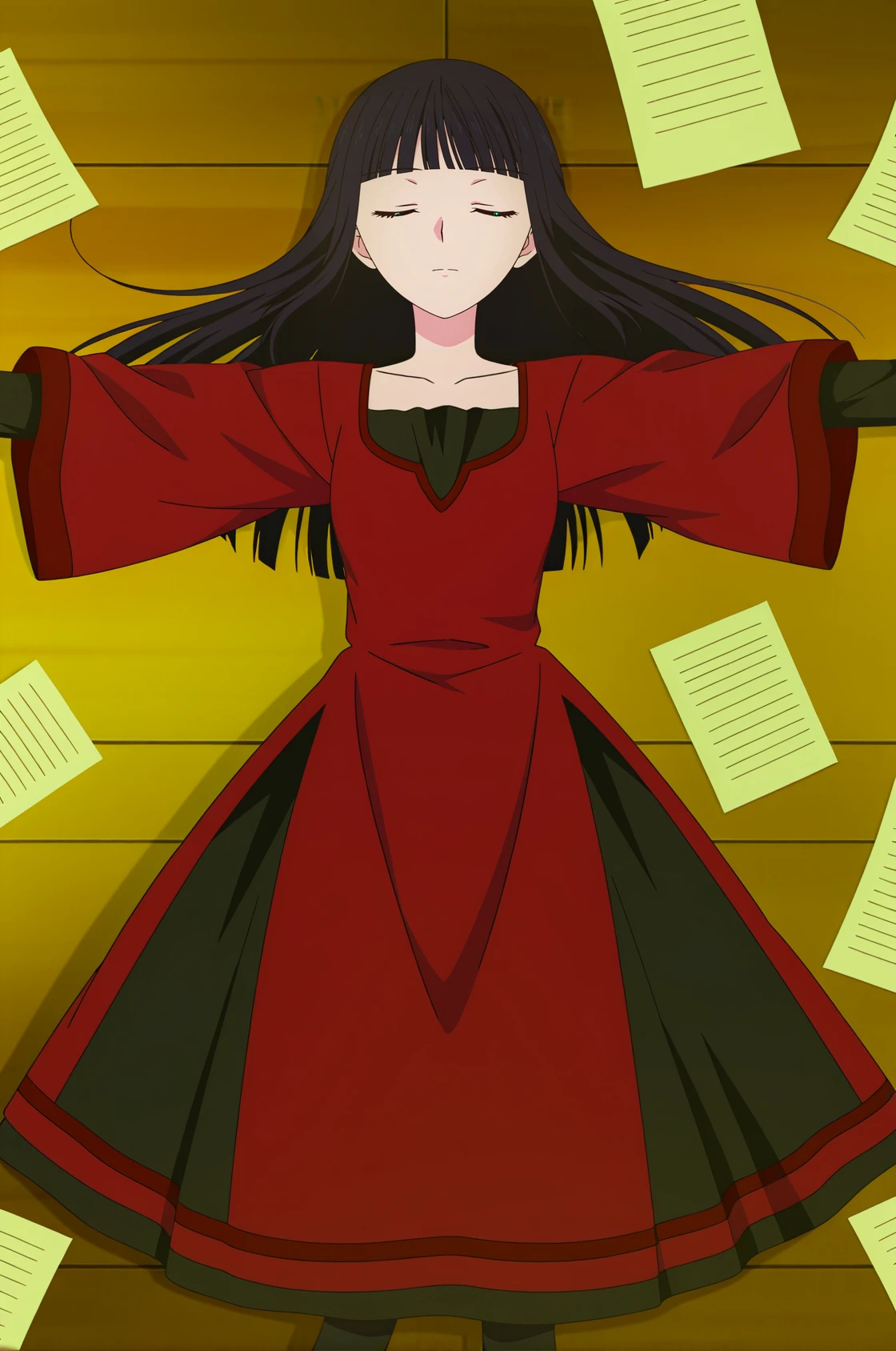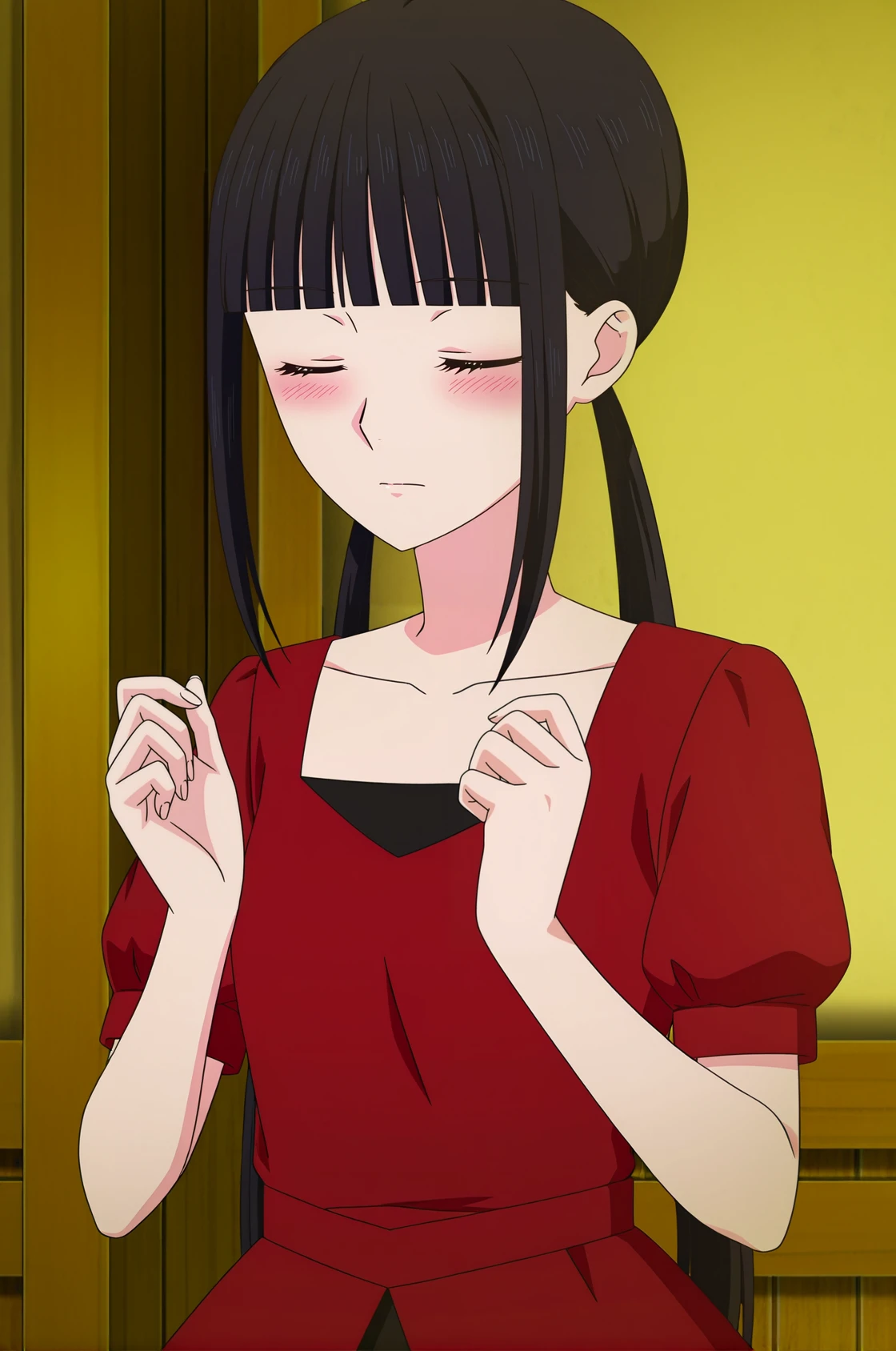purple eyes,blunt bangs,black hair,Clothes: