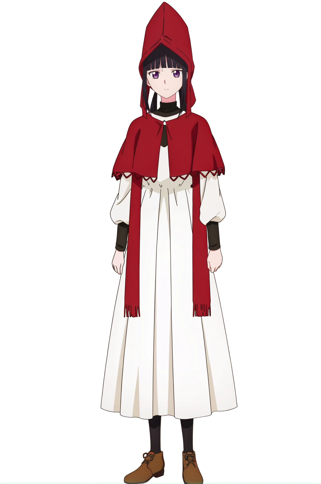 red hat,red shawl,brown shoes,pointed hat,black pantyhose,long sleeves,long skirt,white dress,---------------------->