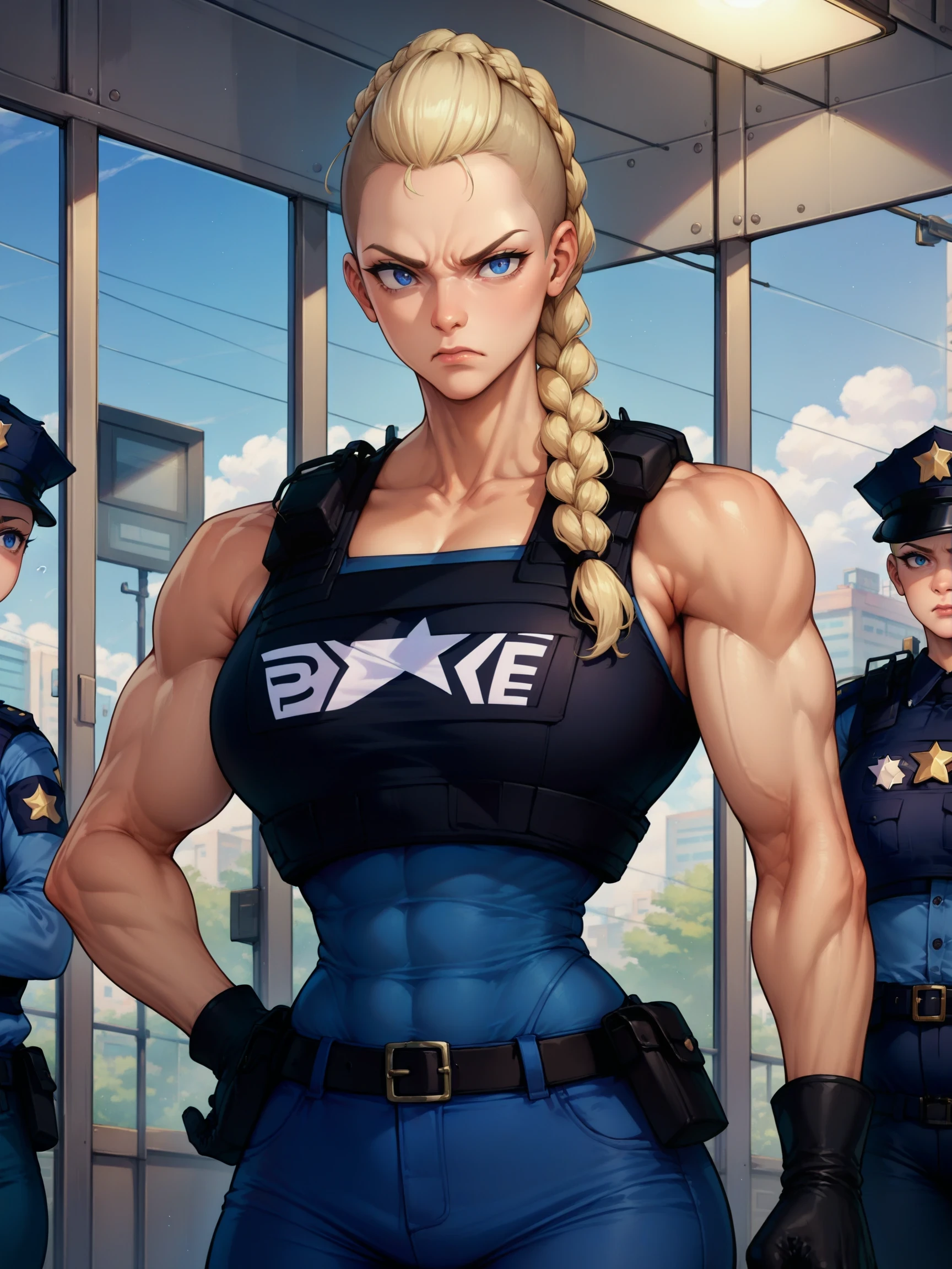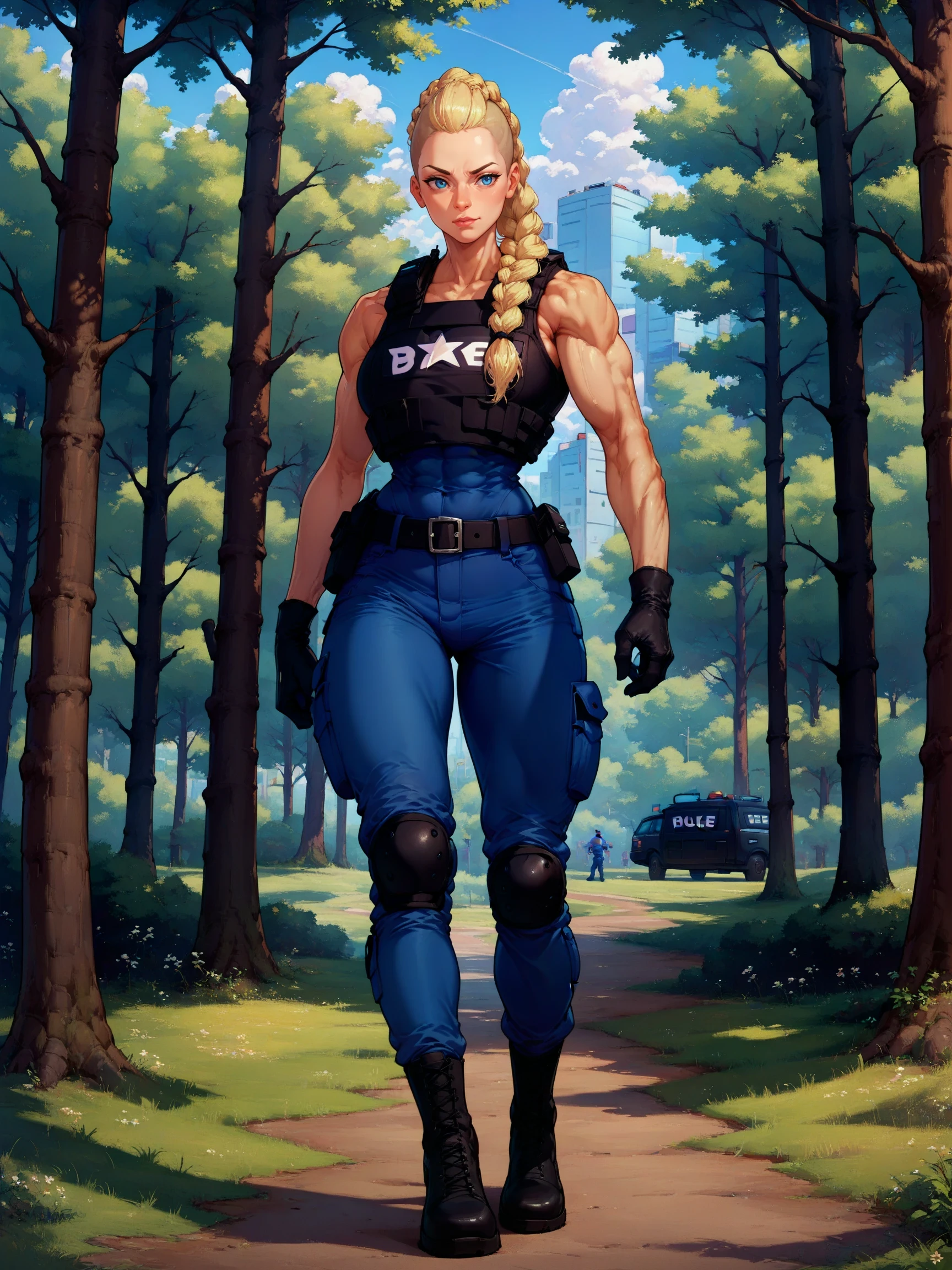 blue pants, gloves, pants, vest, bulletproof vest, braid, boots, knee pads, belt, police, police uniform