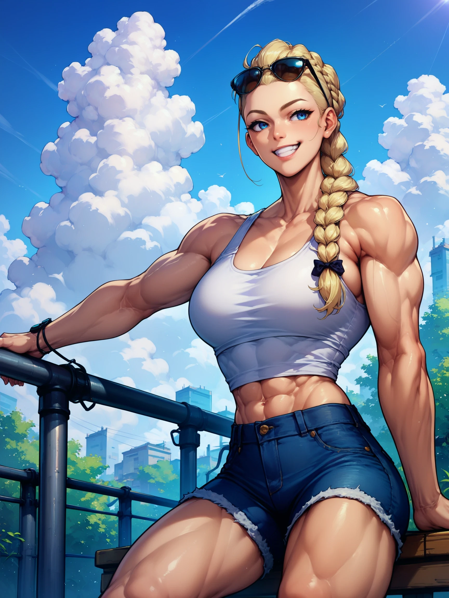 Trigger: estelxl, blonde hair, single braid, muscular female, 1girl, blue eyes, muscular