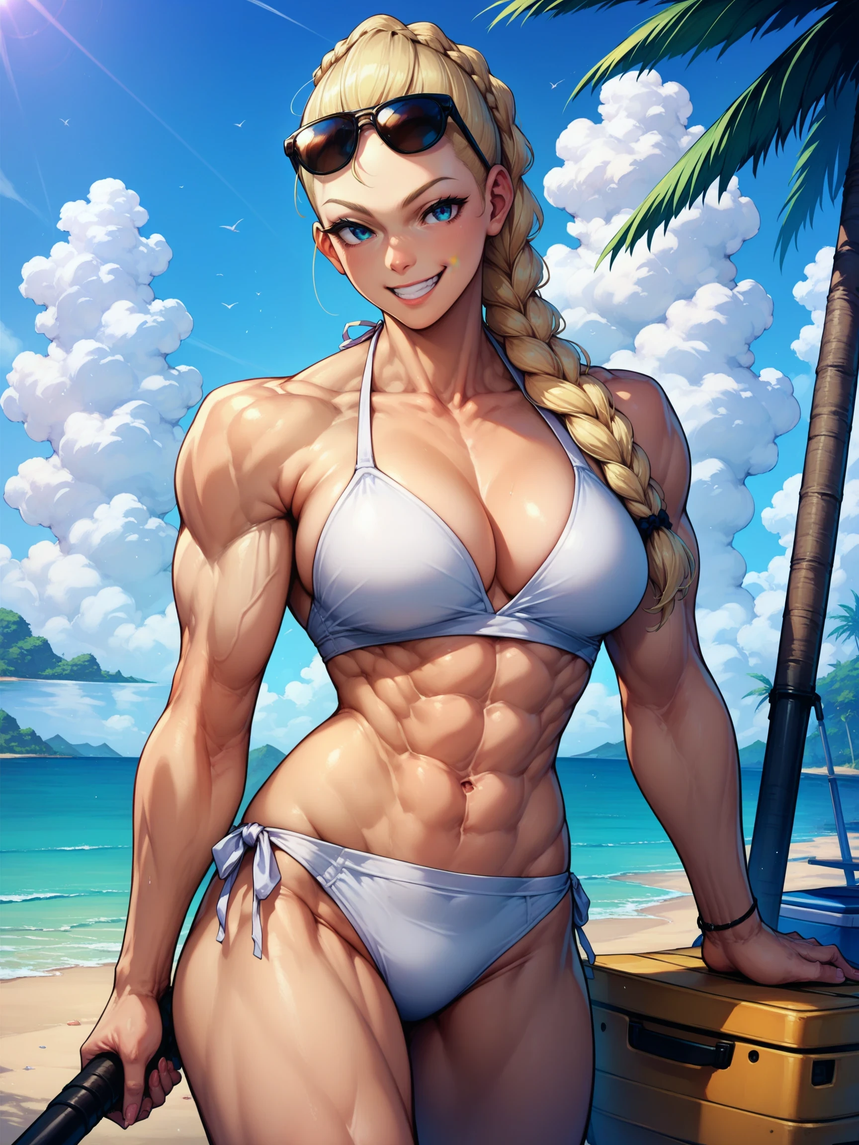 estelxl, blonde hair, single braid, muscular female, 1girl, blue eyes, muscular