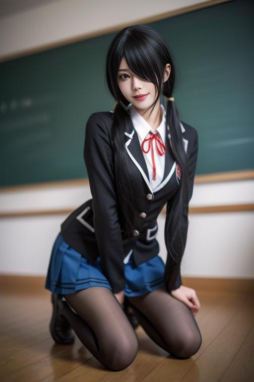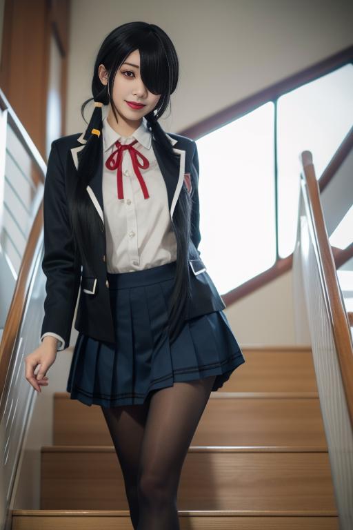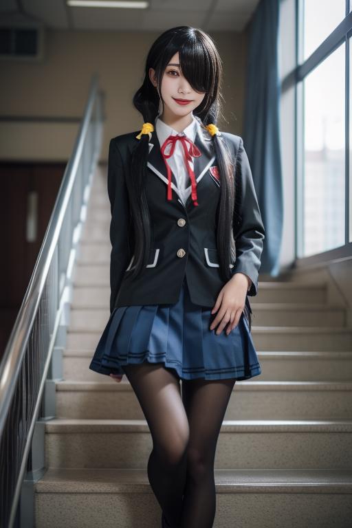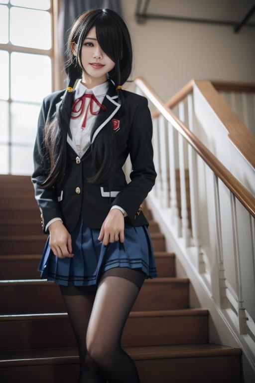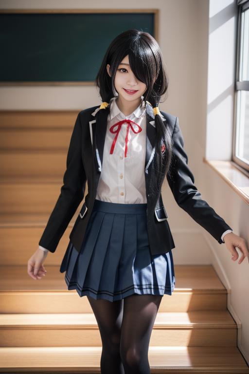 school uniform, blazer, collared shirt, neck ribbon, pleated skirt, pantyhose, hair rings, loafers,