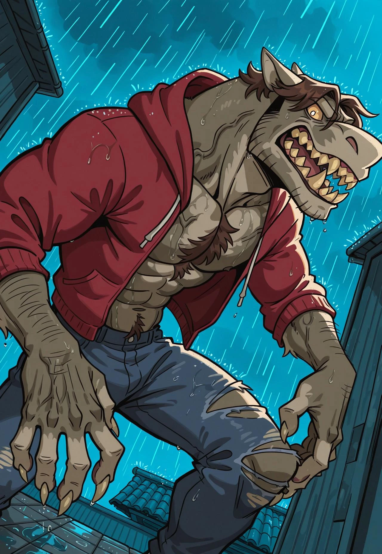 NBeatriz, furry male, solo, muscular, brown hair, animal ears, white pupils, yellow sclera, sharp teeth, red hoodie, open clothes, chest hair, veins, claws, blue torn pants,
