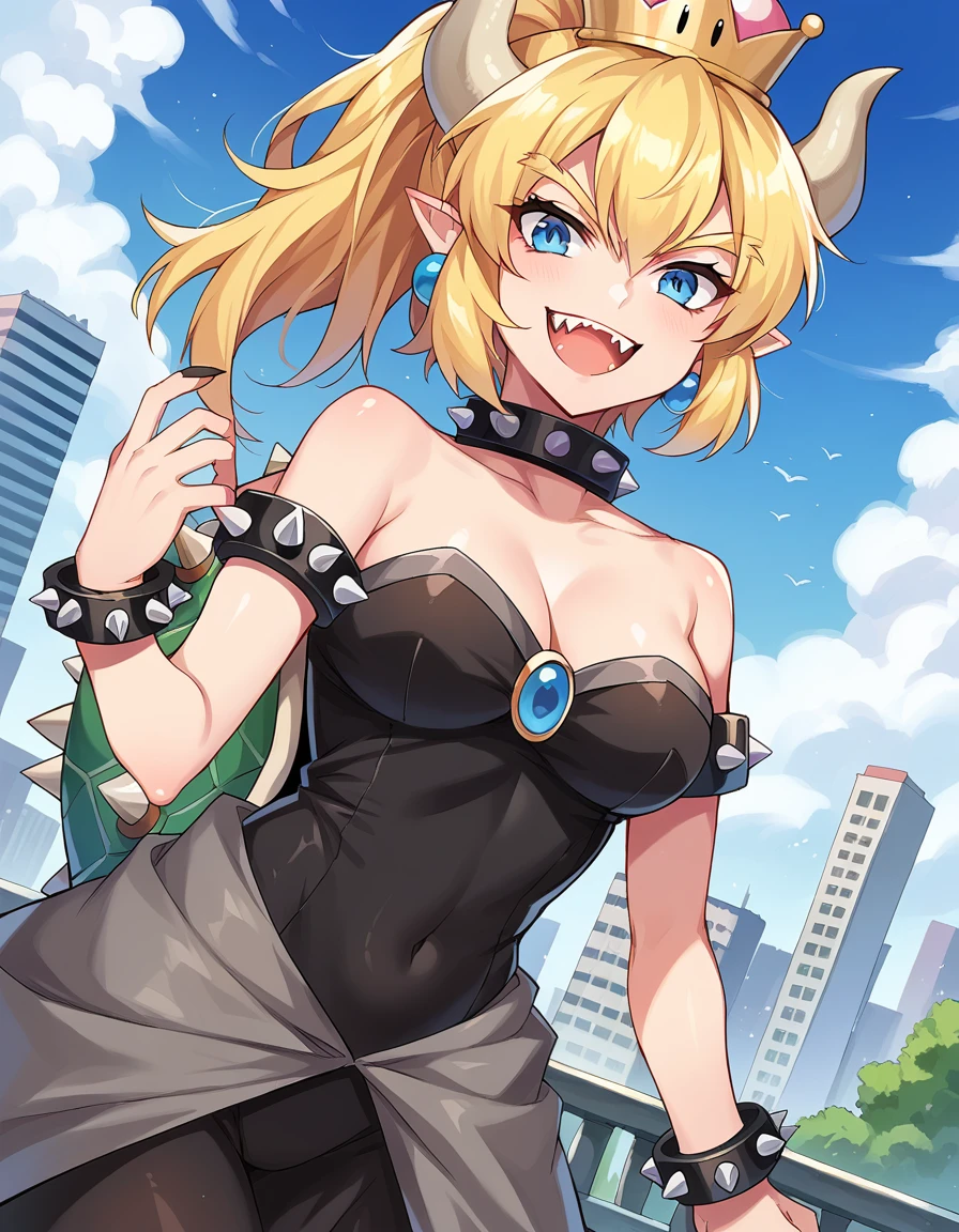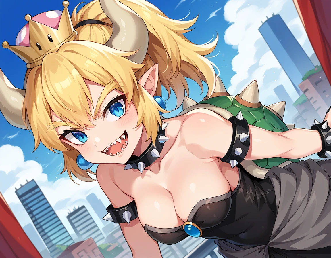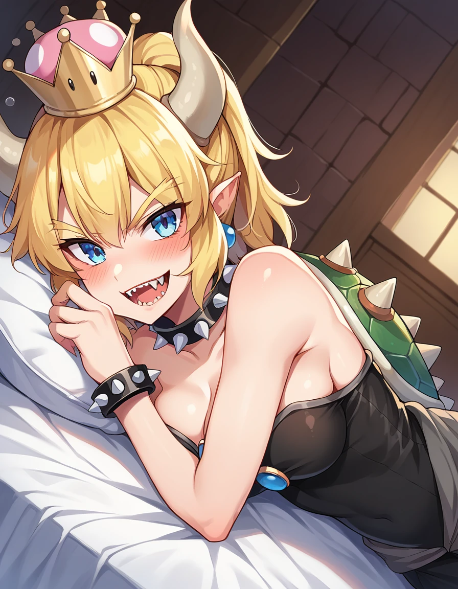 bowsette, blue eyes, blonde hair, ponytail, medium hair, sidelocks, pointy ears, horns, crown, smile, teeth, fangs,