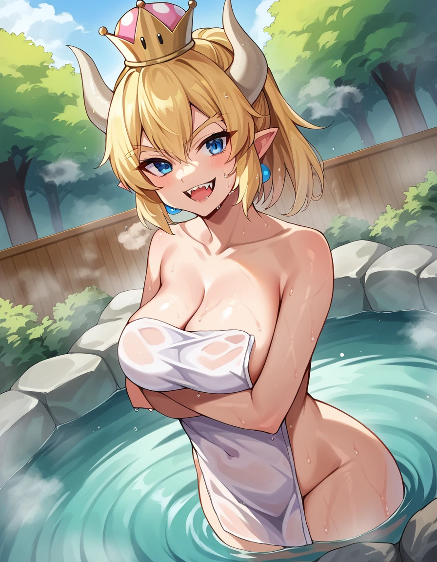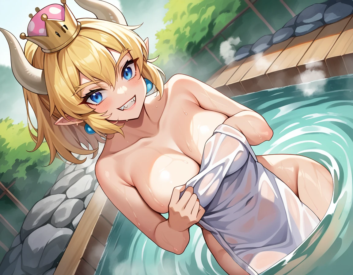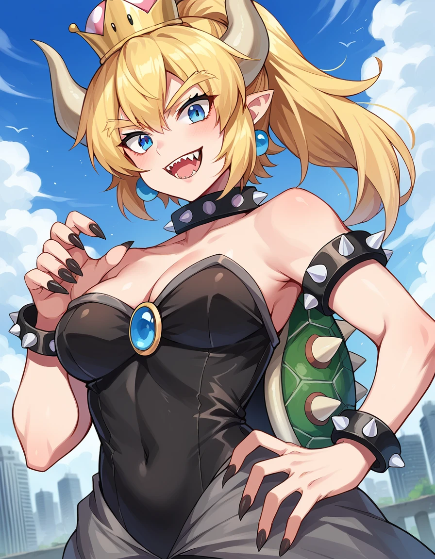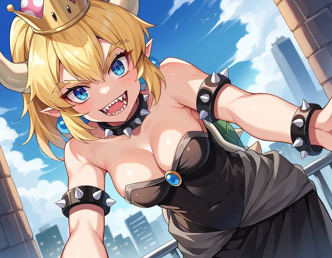 bowsette, blue eyes, blonde hair, ponytail, medium hair, sidelocks, pointy ears, horns, crown, smile, teeth, fangs,