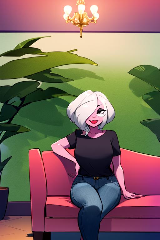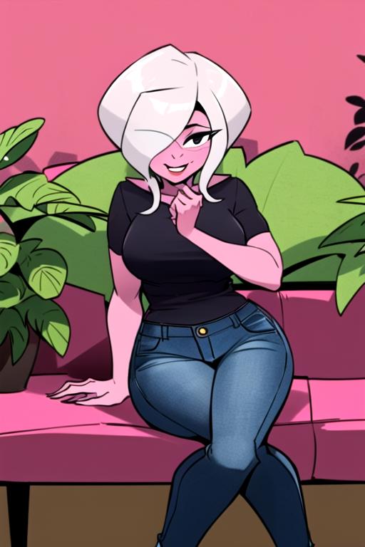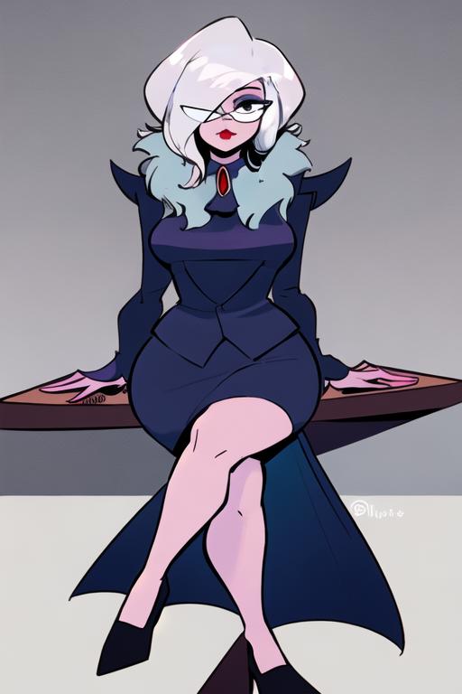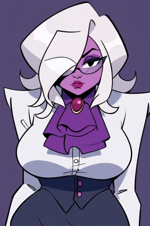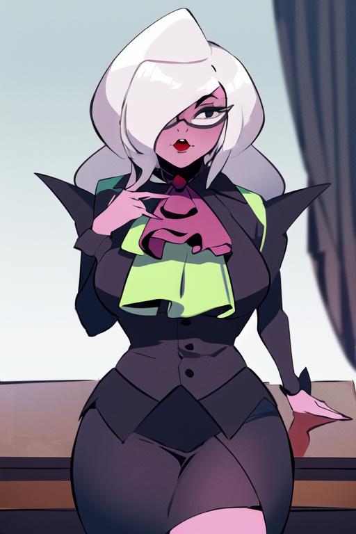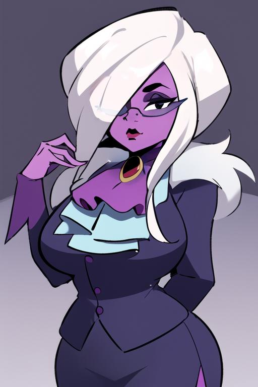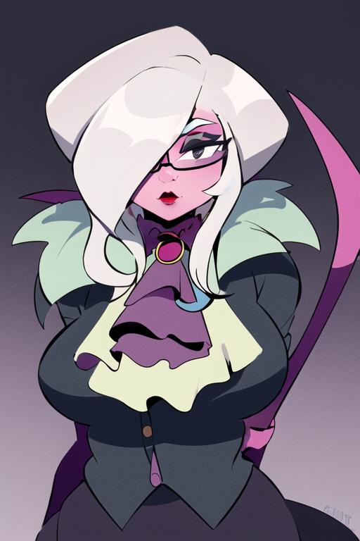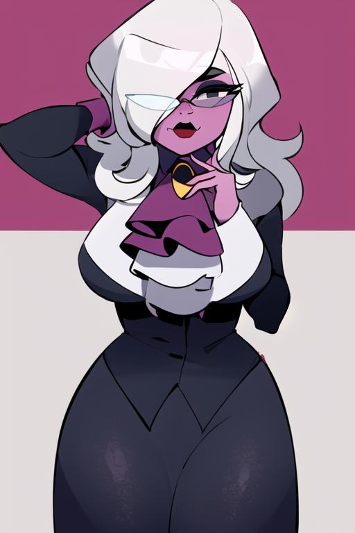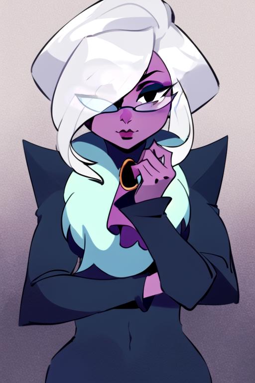 1girl, solo, grey hair, hair over one eye, glasses, colored skin, pink skin, black eyesWould you like to have a model of a character, object, or concept? Contact me; I can assist you