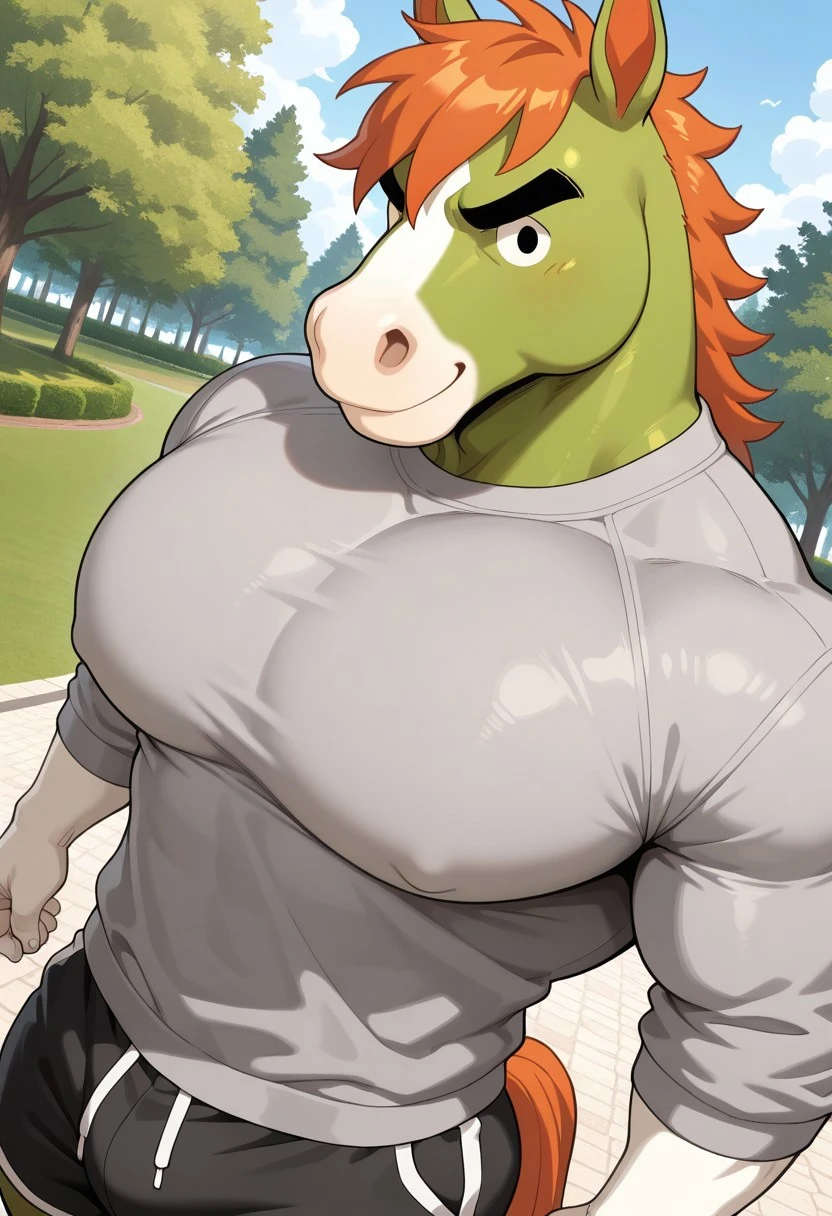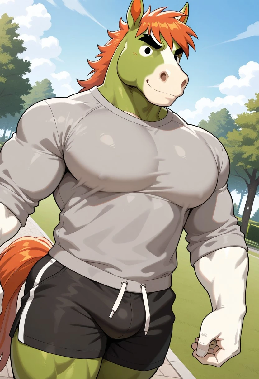 grumpy eyes, dot eyes, white hands, Big pecs, gray sweatshirt, solo, male, horse, anthro, green body, tan mouth, tan hands, Orange hair, Orange tail, black eyebrows,
