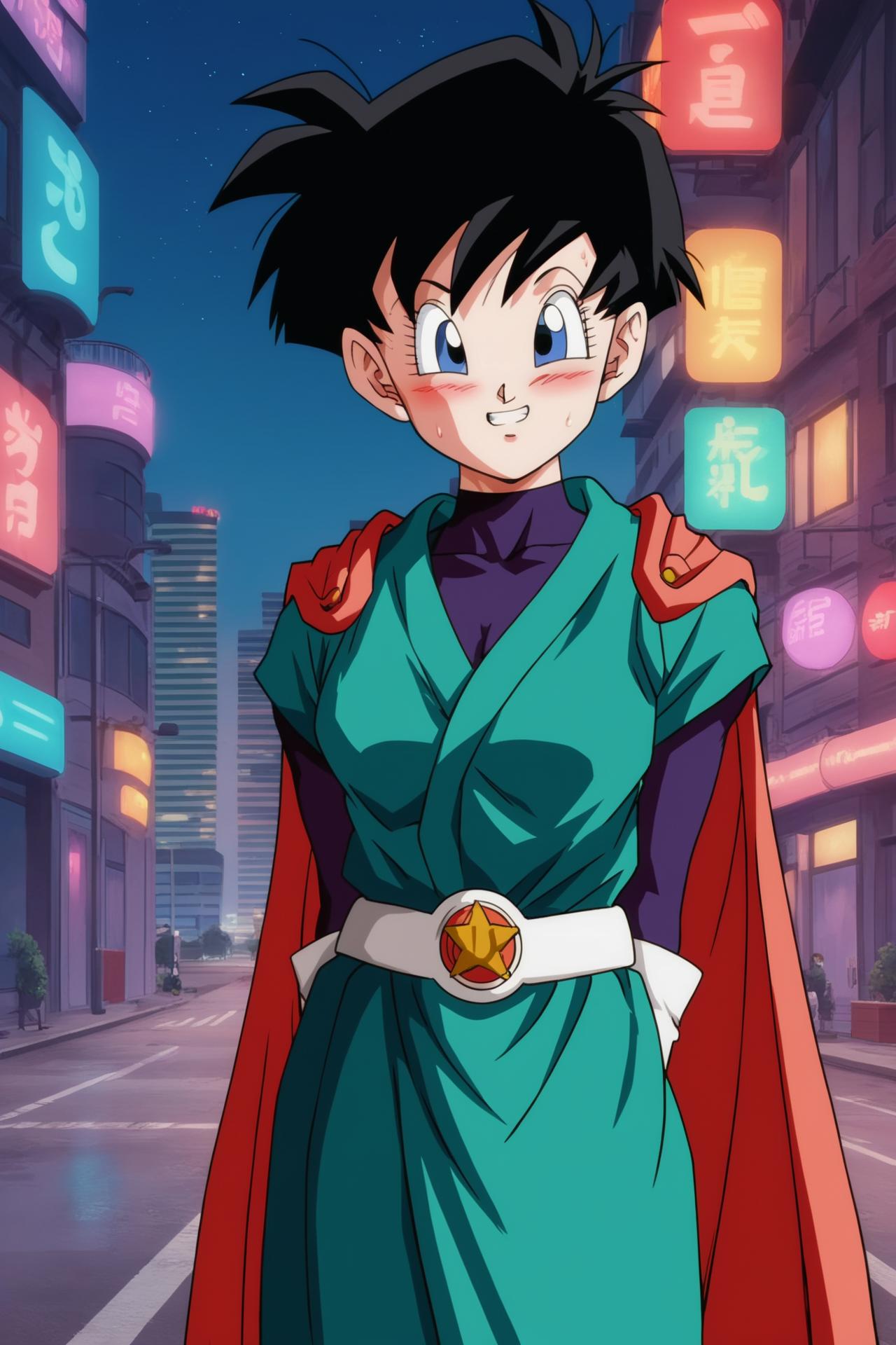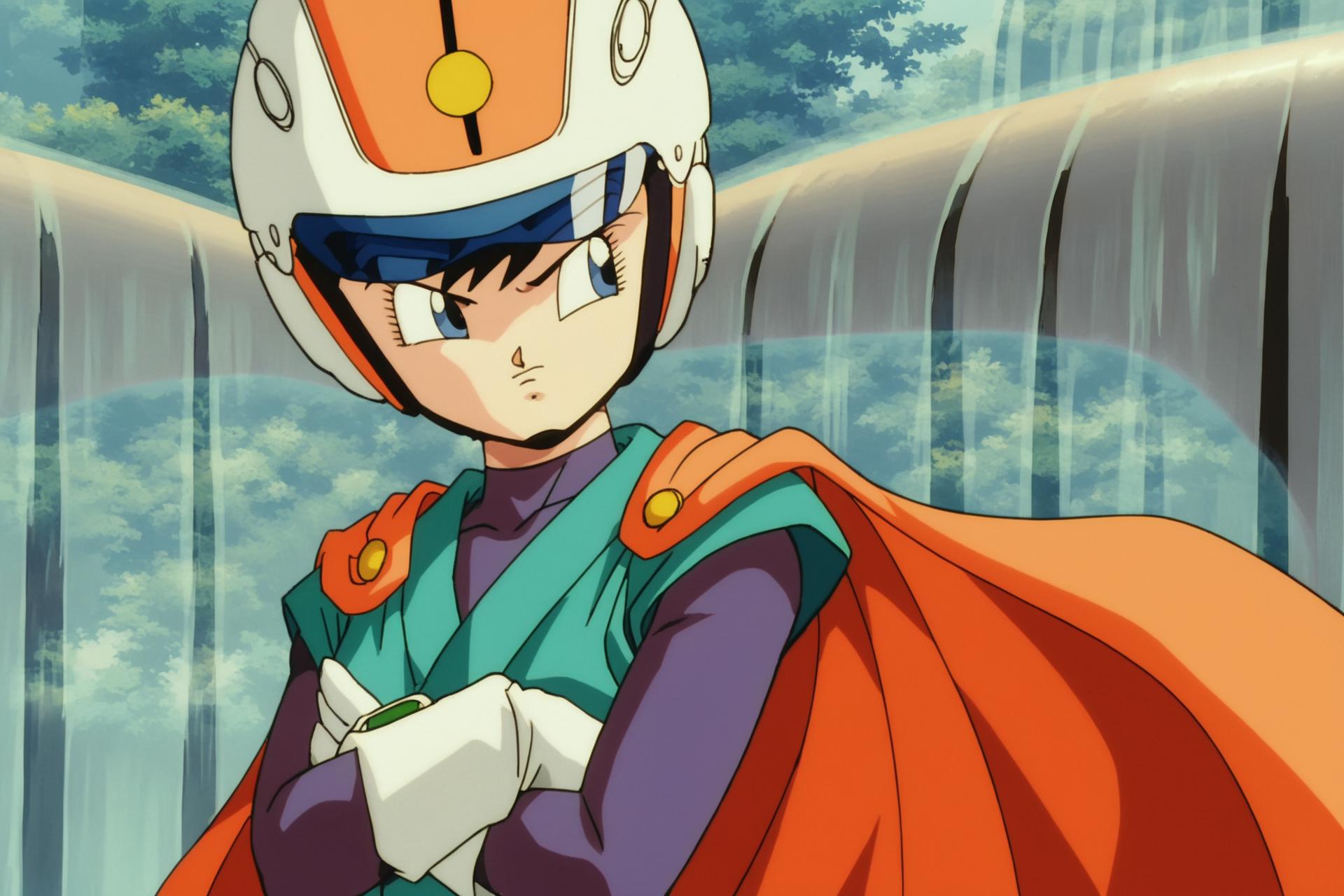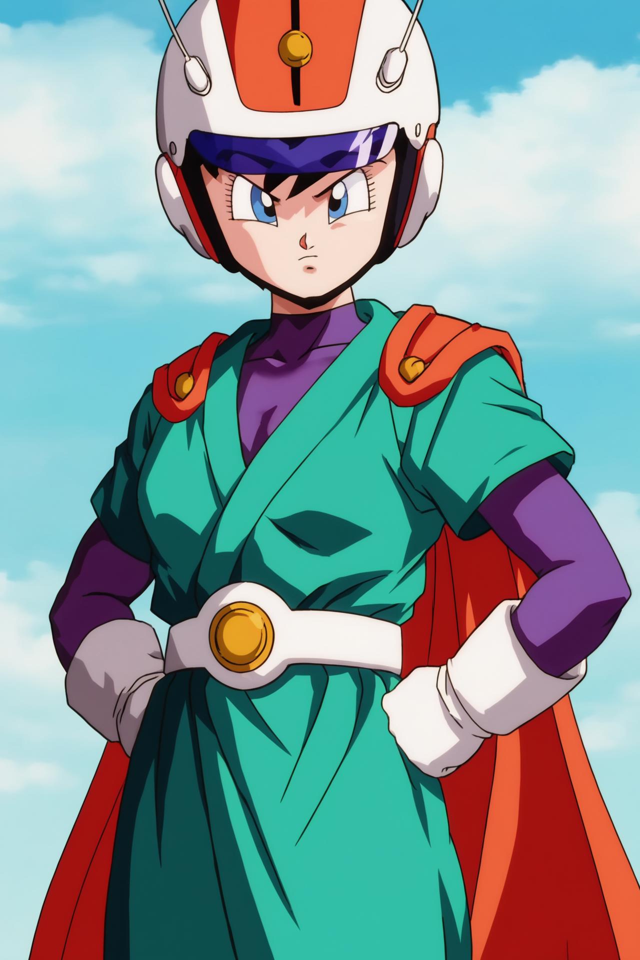 Great Saiyaman 2 : great saiyaman 2, purple bodysuit, green tunic, white belt, boots, white gloves, white_footwear, red cape, white footwear,