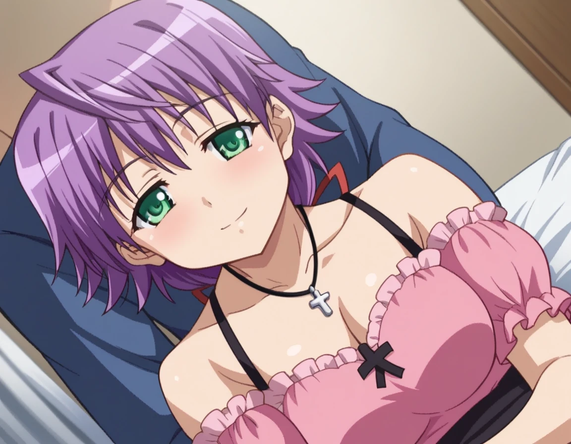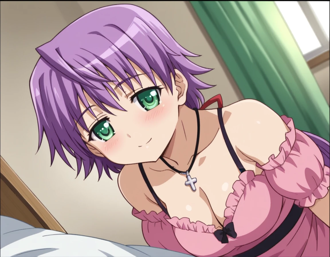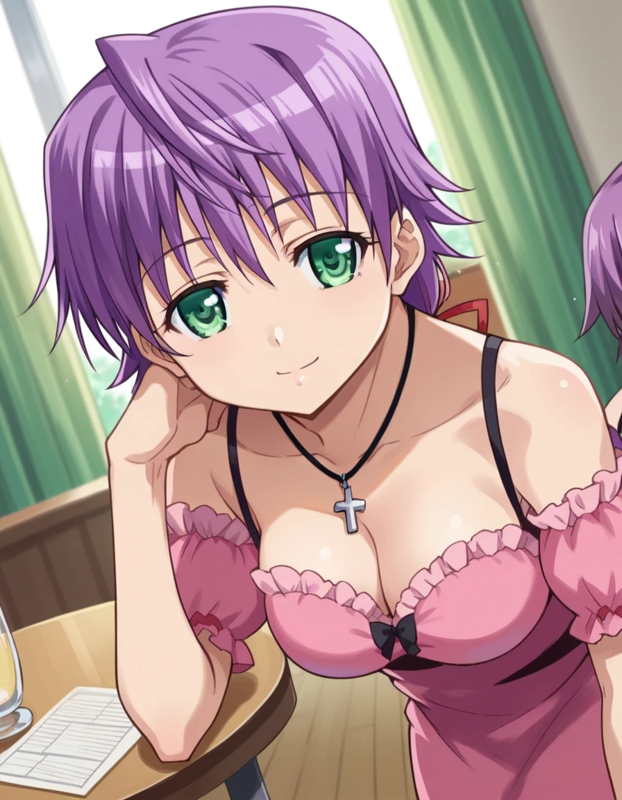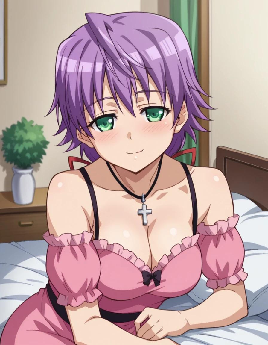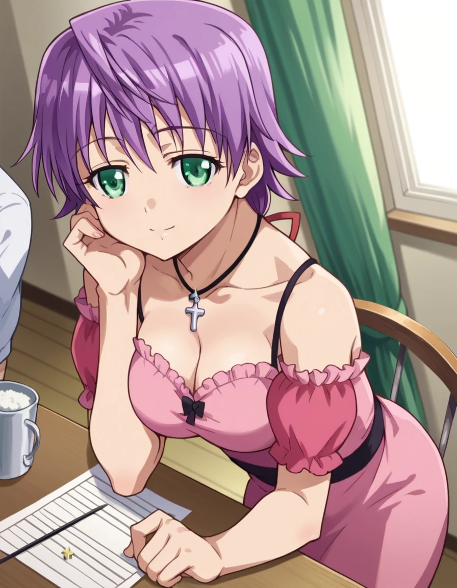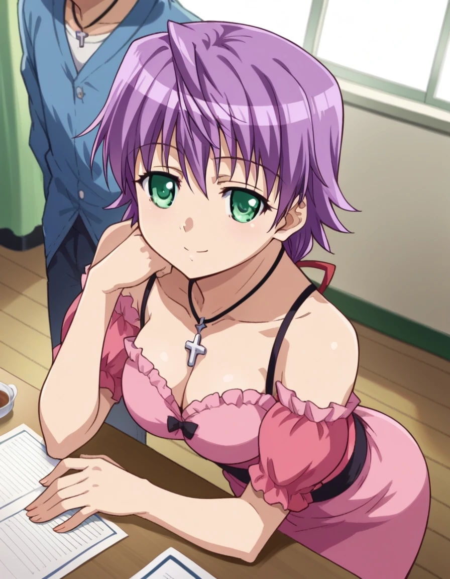bare shoulders, necklace, cross, dress, pink dress, cleavage,