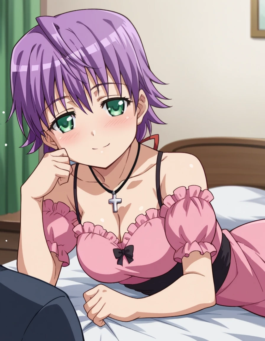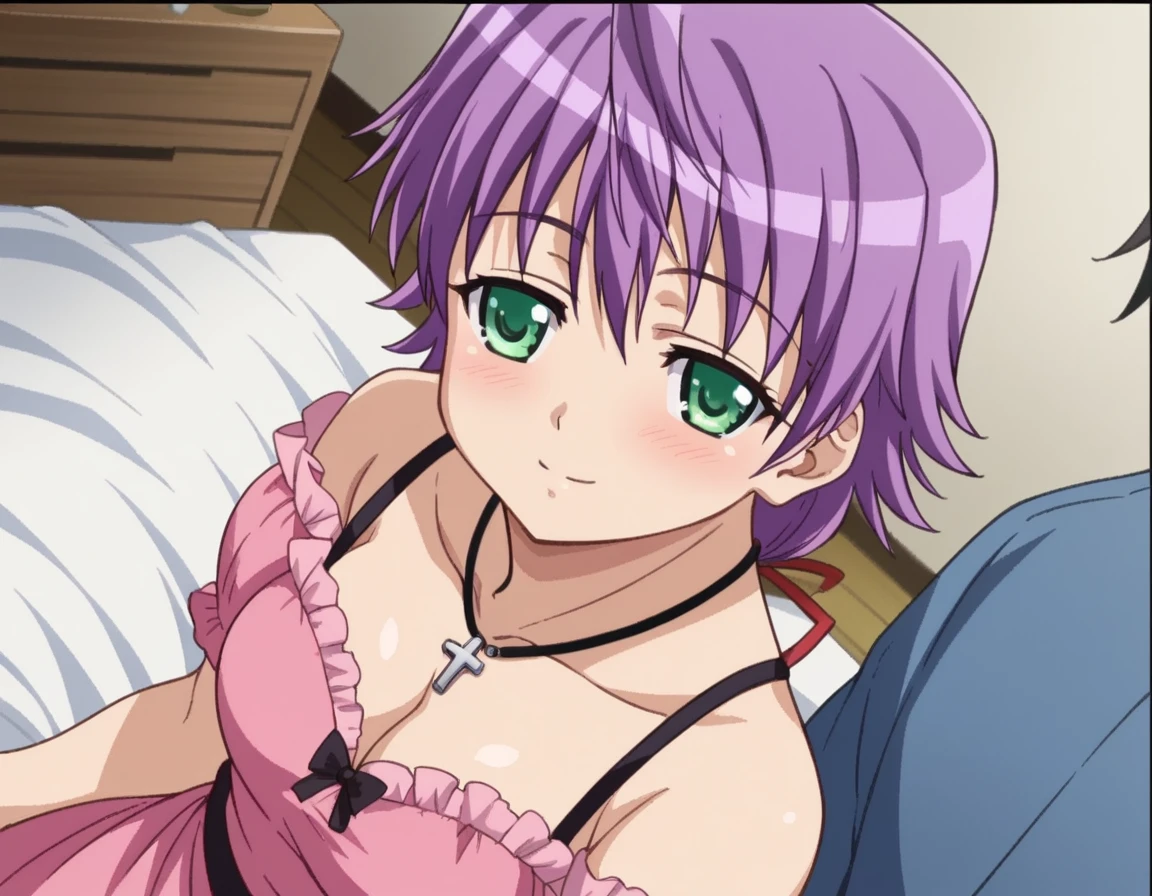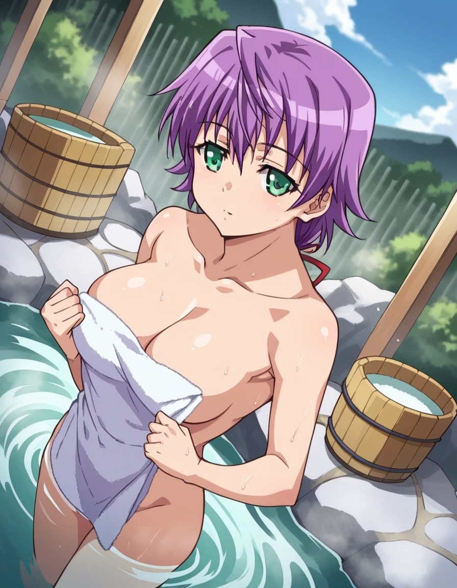 natsumi orifushi, short hair, green eyes, purple hair,