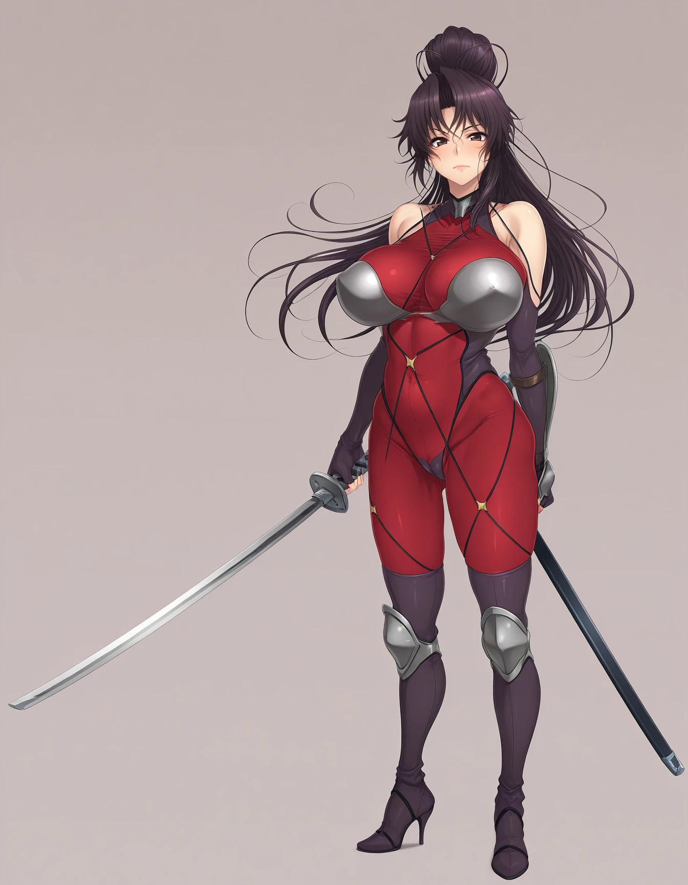 mai_fnao,game_cg,mai_azusavo,mature_female,long_hair,ponytail,purple_hair,brown_eyes,huge_breasts,ninja,bodysuit,skin_tight,elbow_gloves,fingerless_gloves,armor,bare_shoulders,black_thigh_boots,high_heels
