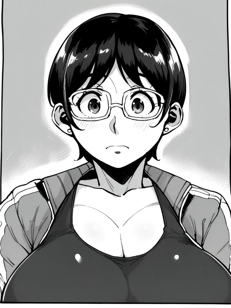 sayu mc, black hair, blunt bangs, twintails, hair bobbles, huge breasts, glasses,