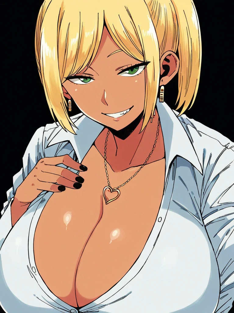 tomoka mc, dark-skinned female, white hair, huge breasts, short hair,