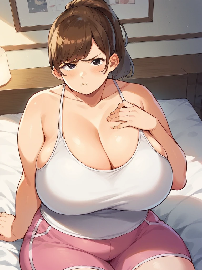 Friend's Mom: mother mc, black hair, low ponytail, hair scrunchie, huge breasts,