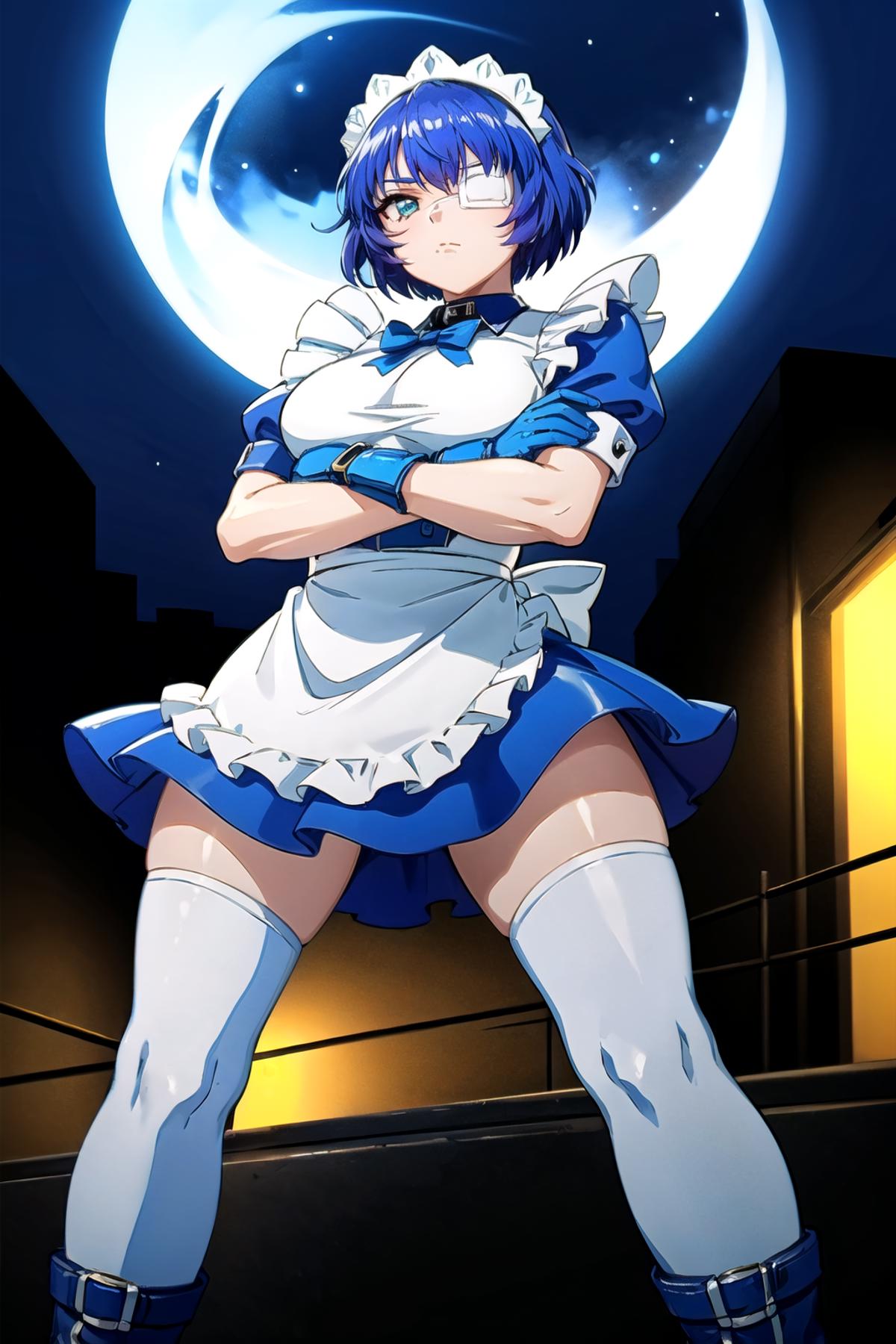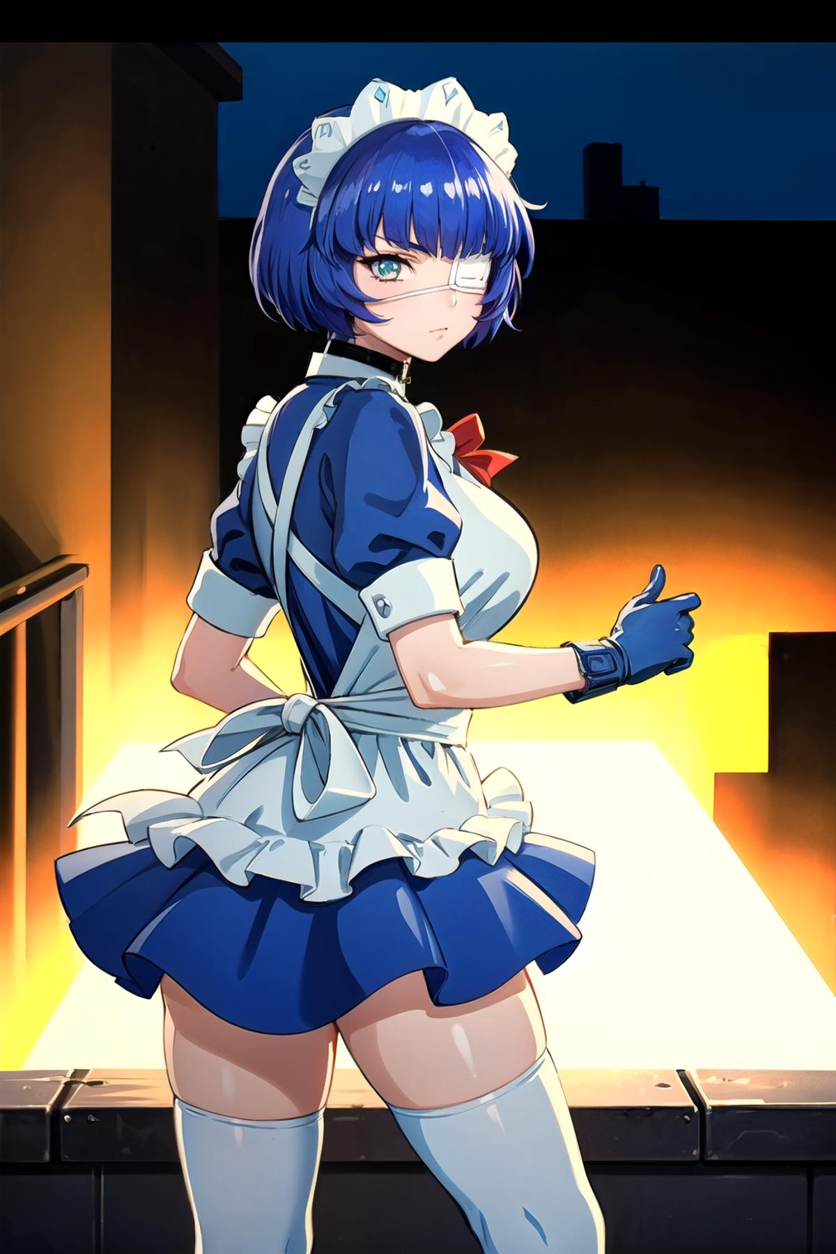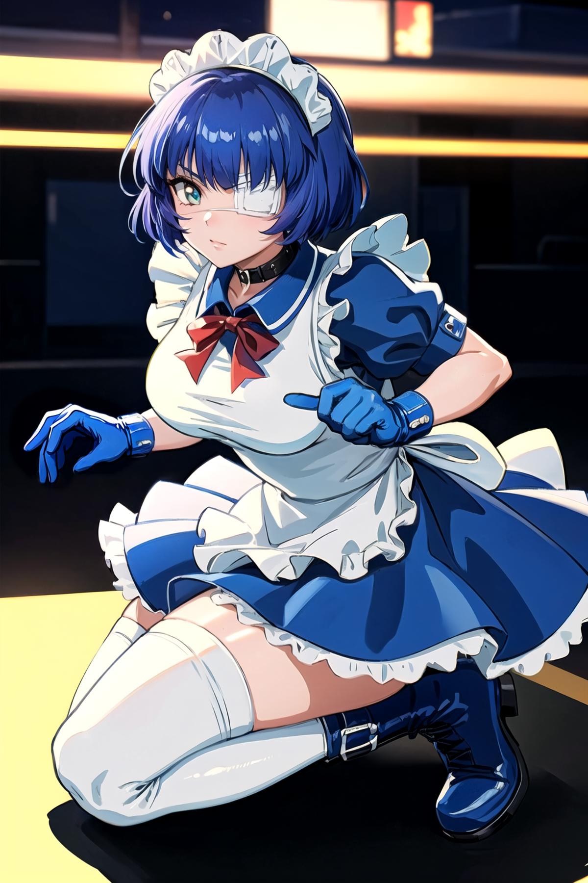 Made outfit - ryomou shimei, maid, medical eyepatch, maid headdress, collar, red bowtie, blue dress, maid apron, blue gloves, white thighhighs, boots
