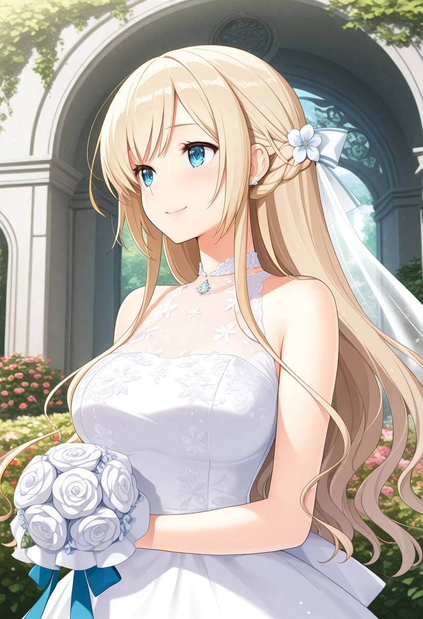 blonde hair, long hair, bangs, half updo, braid, french braid, hair ribbon, blue eyes, large breasts, necklace, (change "half updo" to "updo" for timeskip style)